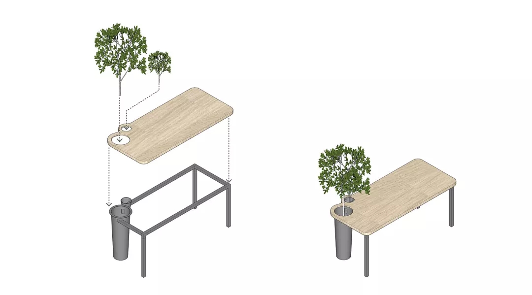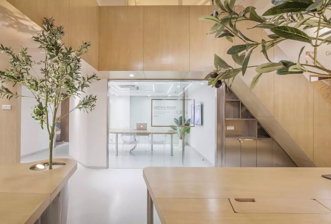 同時我們希望有一個張別具一格的會議桌,但是會議桌極強的功能性使得難以去進行改變。于是,會議室空間本身的形狀缺陷成了這張桌子想法的起點。由于避讓入口玄關,會議室空間有一個角是切掉的,墻壁是斜著放置,如果是長方形的會議桌,就必然在這個斜墻前造成使用空間不夠缺陷,無法坐人.所以就產生了一個平行四邊形的會議桌,斜邊與空間的斜墻平行,也讓整個斜墻前的空間可以坐下一個參會者,再嵌入一些小草,一張獨特又實用的會議桌就出來了。