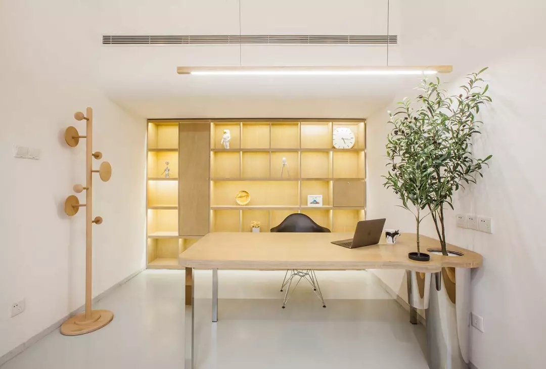 該項目位于上海市閔行區(qū)七寶萬科國際;我們希望工作室足夠的輕松、溫性、創(chuàng)意,于是通過顯性與隱性的符號對我們的目標進行構建;空間用了大量溫暖的木色,并組成木質的空間體塊,這些體塊以整個白色空間為背景,進行功能與空間節(jié)奏上的構筑: