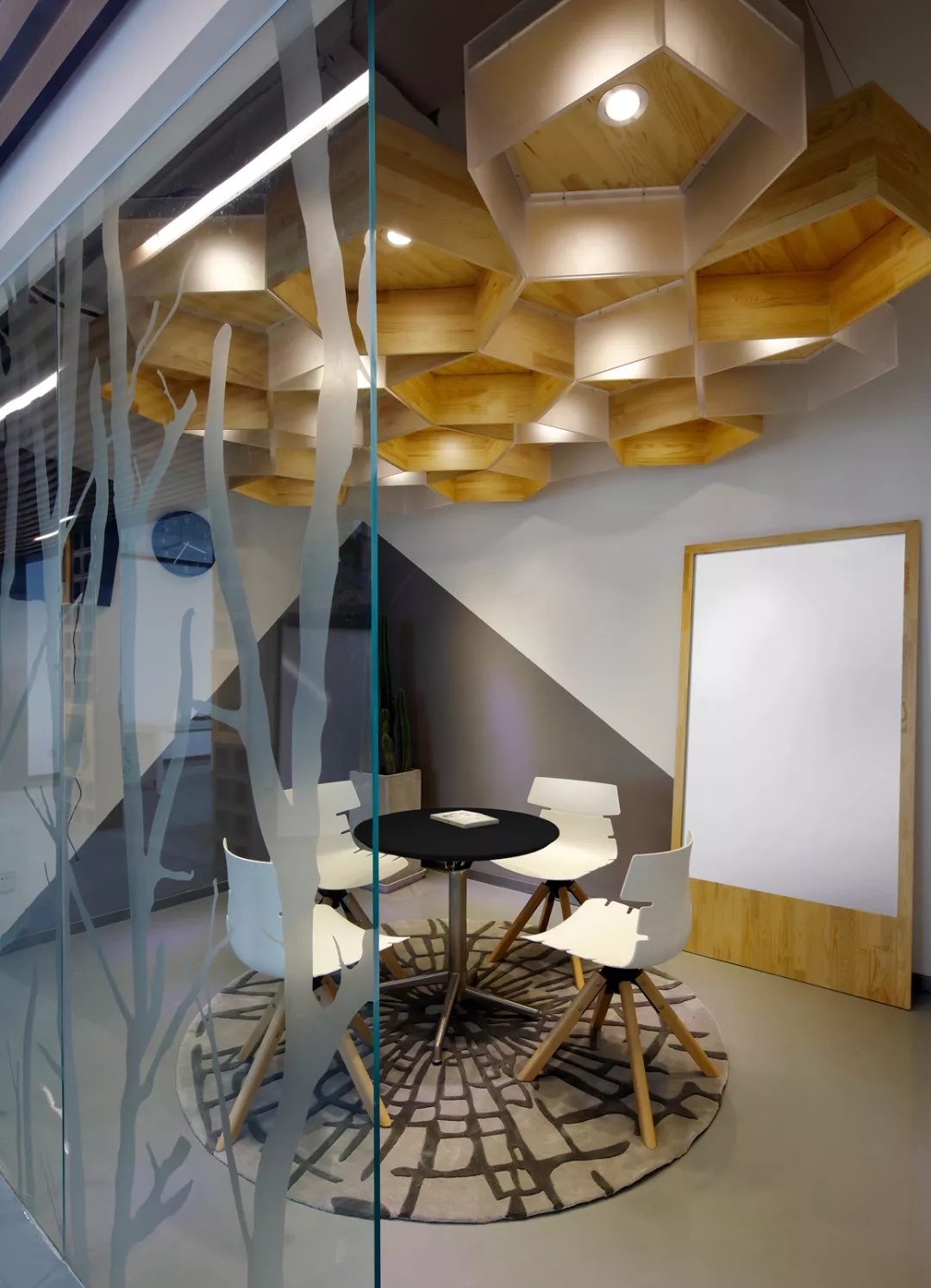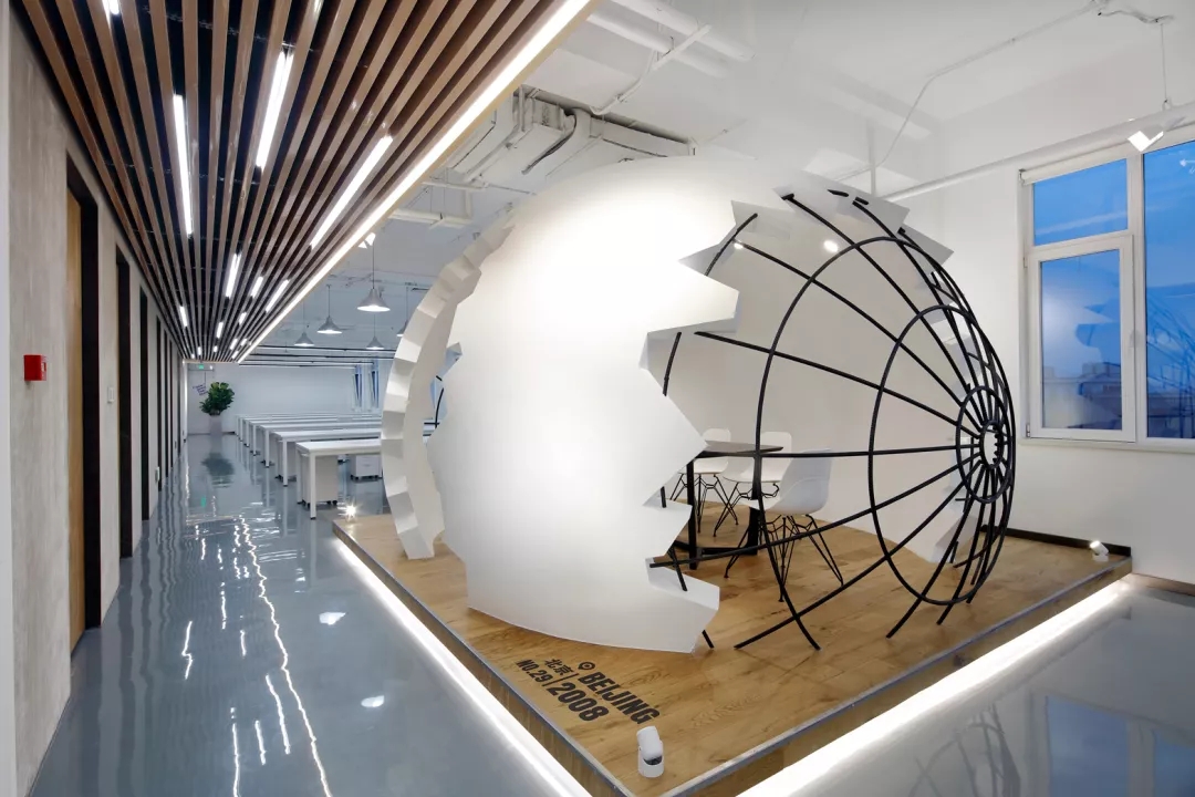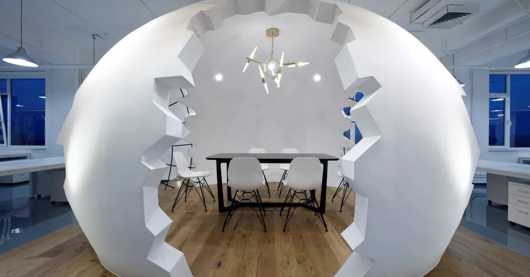 為了給開放式的辦公空間注入活力,我們在排排坐的工位場地正中設(shè)置了“破殼而出“的主形象——巨蛋討論區(qū),橢圓形的蛋壁實現(xiàn)攏音的隔音效果,兩側(cè)的鏤空引入自然光源,令這個裝置藝術(shù)般的討論區(qū)打破開放式工位的沉悶,成為視覺焦點。