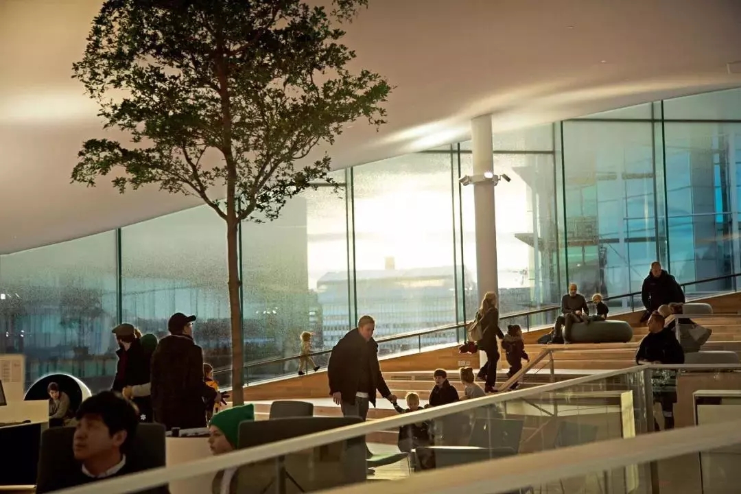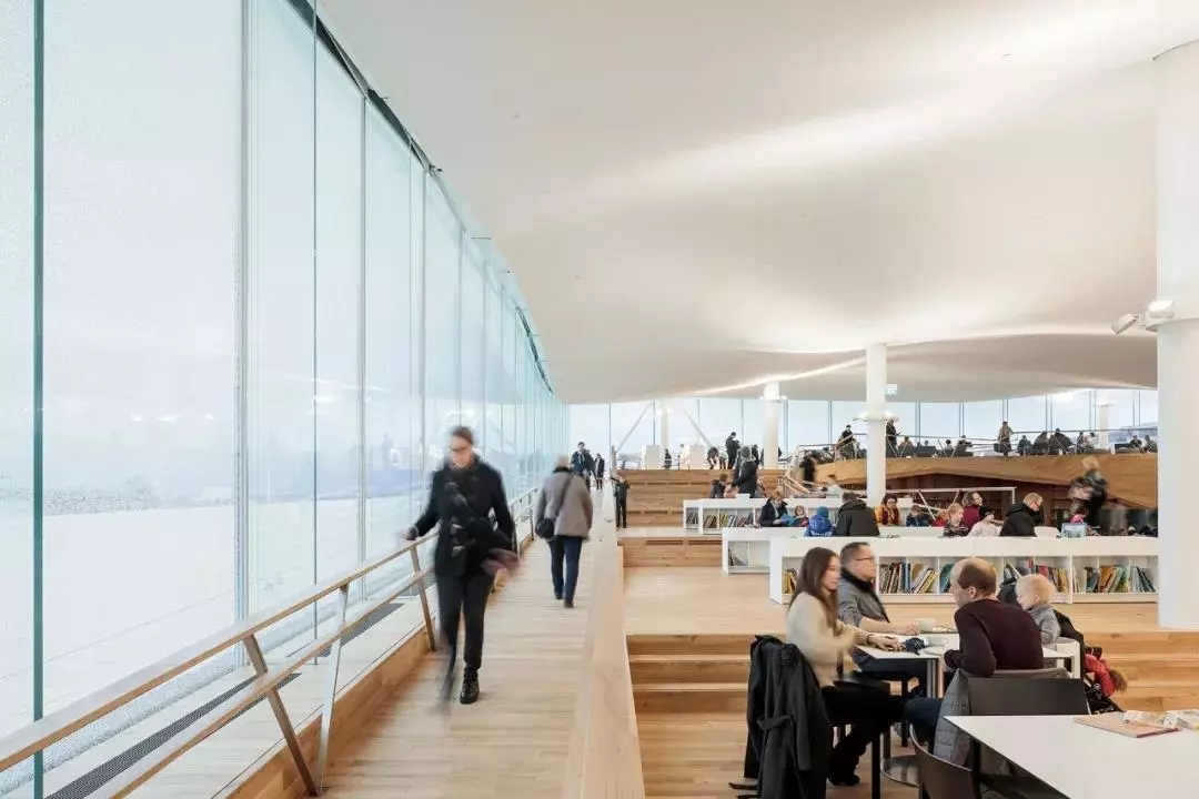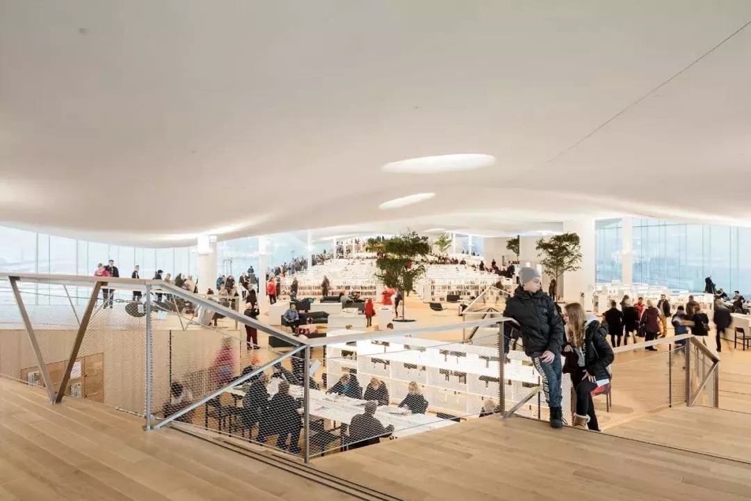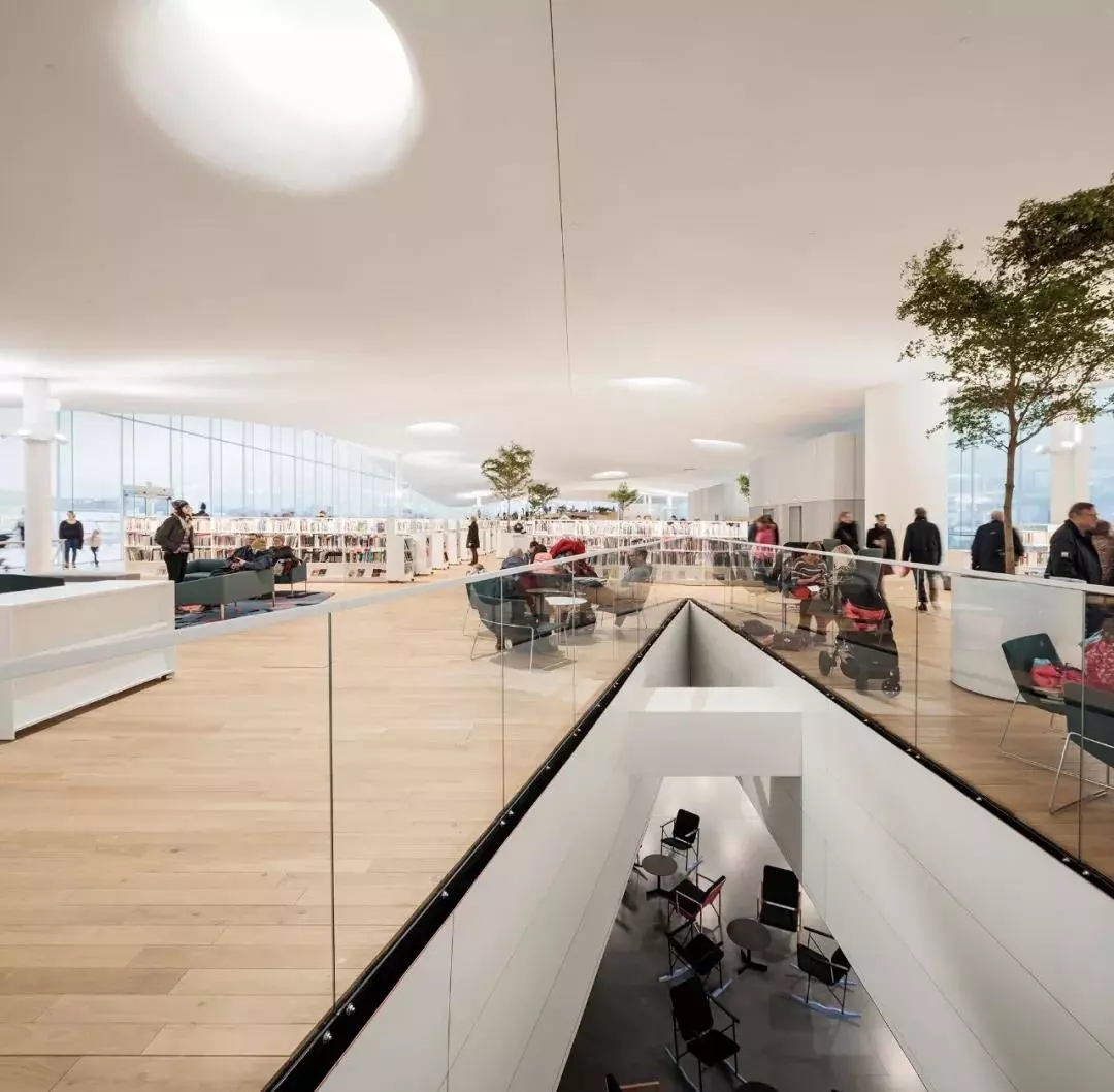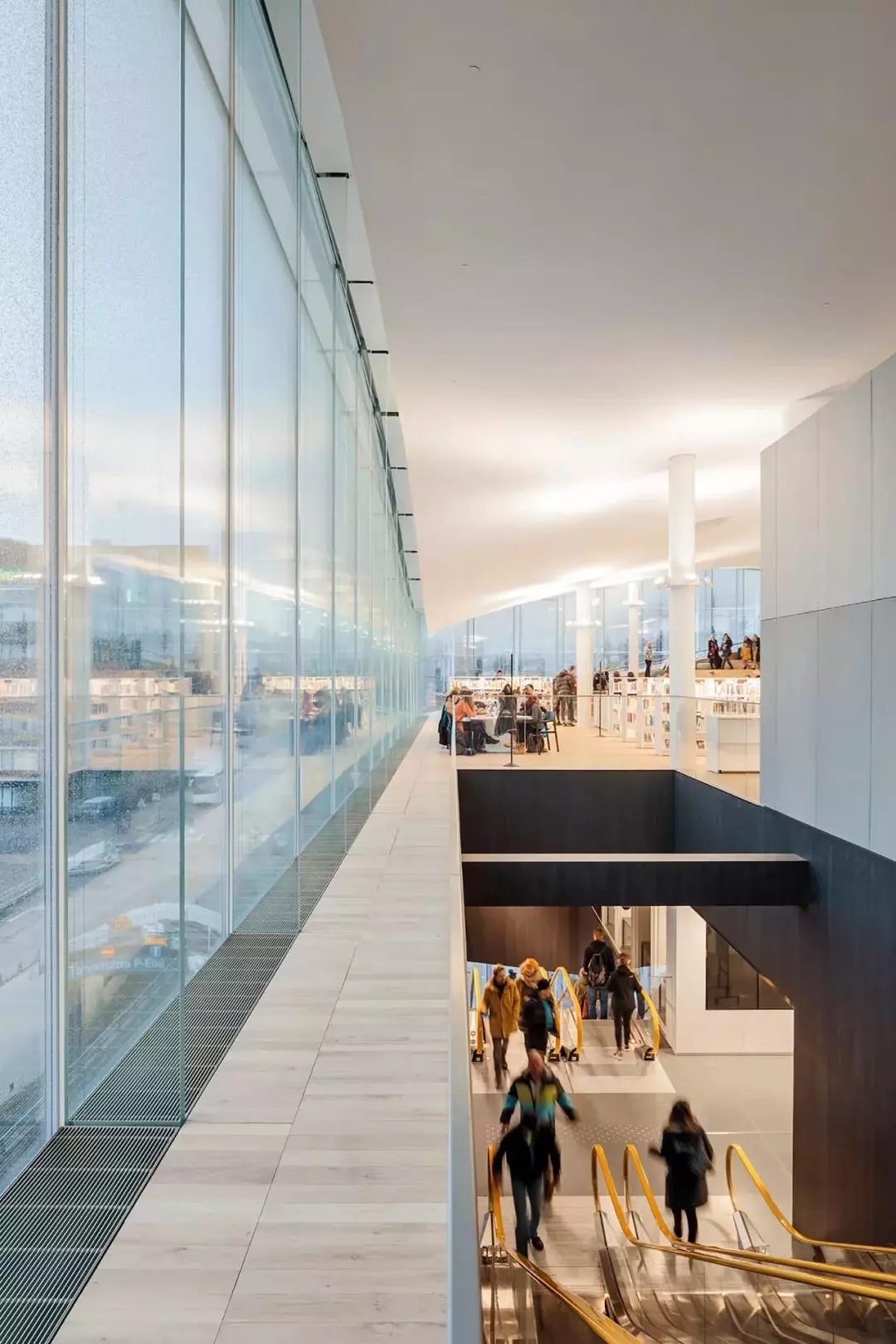 橋的上端所支撐的,被建筑師稱為“亭子”的,就是頂層“書(shū)的天堂”。周邊全部玻璃墻圍住,似乎懸空于橋上。充分利用自然采光,這在北歐冬季,日照極為短暫的天況下,顯得尤為重要。