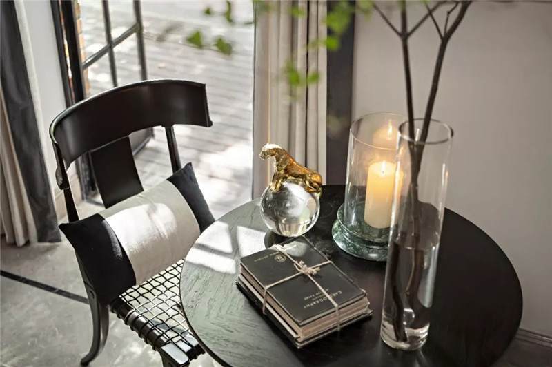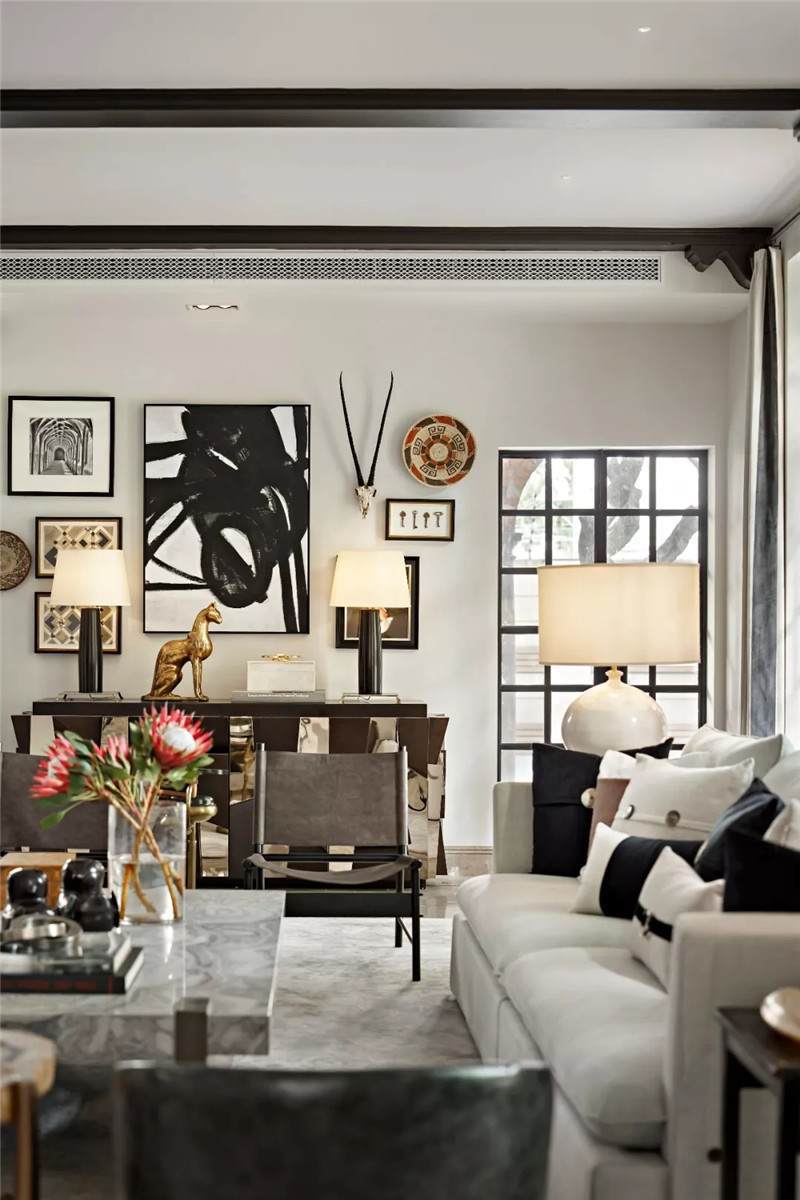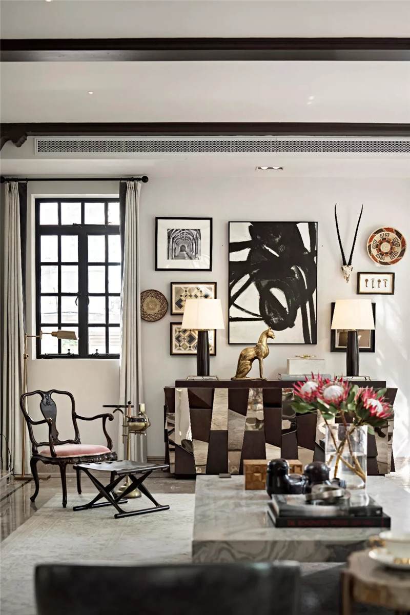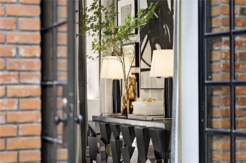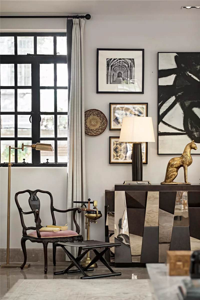 起居室背景展示墻,以混搭風(fēng)格鋪陳出洛普普的敘事展現(xiàn)。原始的羚羊頭飾,彷若征服野性蠻荒,象征勝利光輝。鑰匙是正在延續(xù)著的權(quán)勢標(biāo)志。設(shè)計師用跳色的編織盤與抽象藝術(shù)畫將微量的彩色疊加進(jìn)黑白灰的間隙中,呈現(xiàn)出別樣、細(xì)膩的風(fēng)情。而左下角的守護(hù)貓,一如埃及傳說中神秘的幸運(yùn)守護(hù)者,正看顧著明亮通透的窗外,不斷朝曦夕映的美好時光。