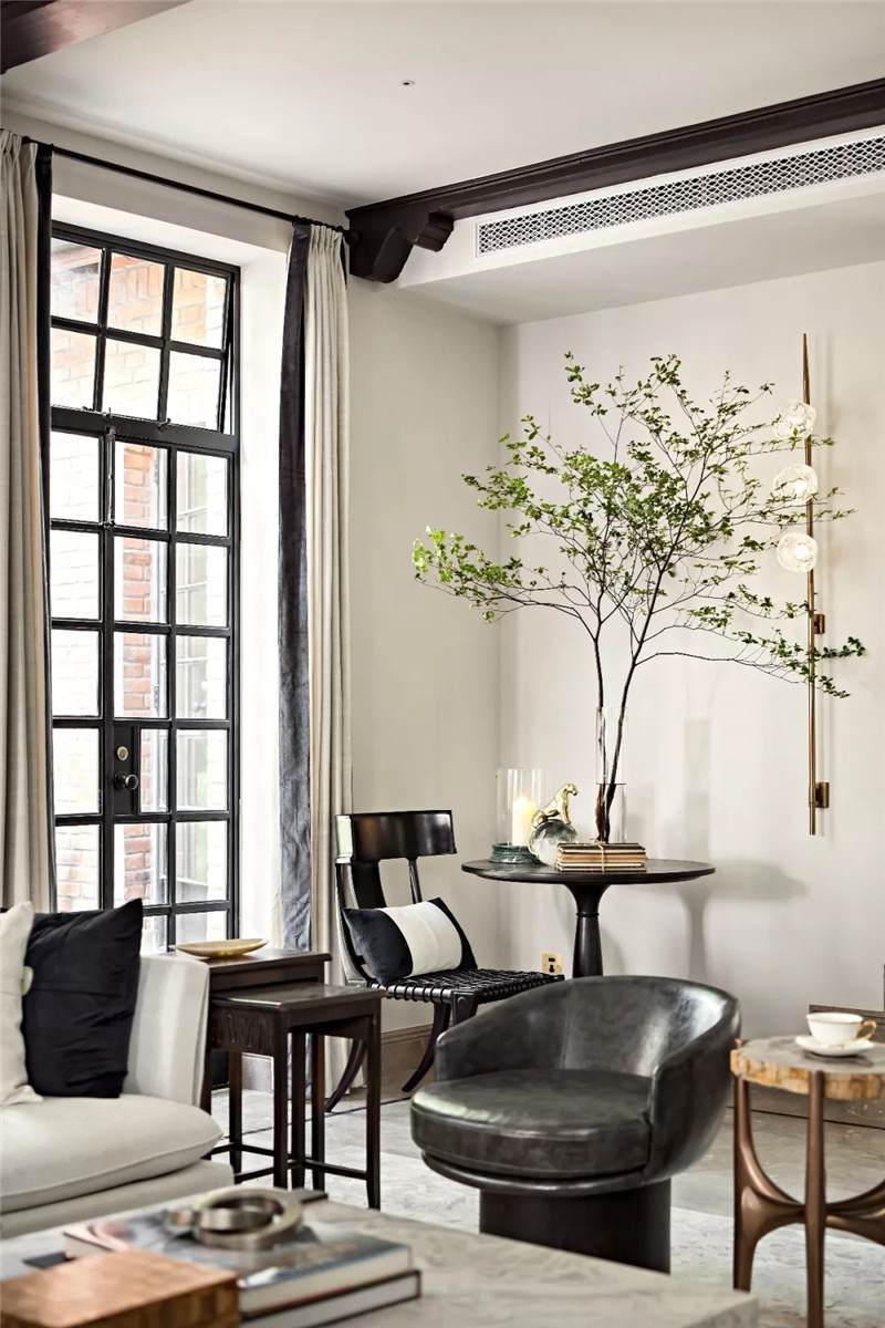 素凈的米白色為空間的主基調(diào),復(fù)古橫梁與老上海窗格將空間輕柔切割,連帶著映入室內(nèi)的光也多了幾分雅致。瓶中綠意與動物水晶球擺件為空間注入靈韻,用自然與優(yōu)雅勾勒出一個原始美麗的自然空間。