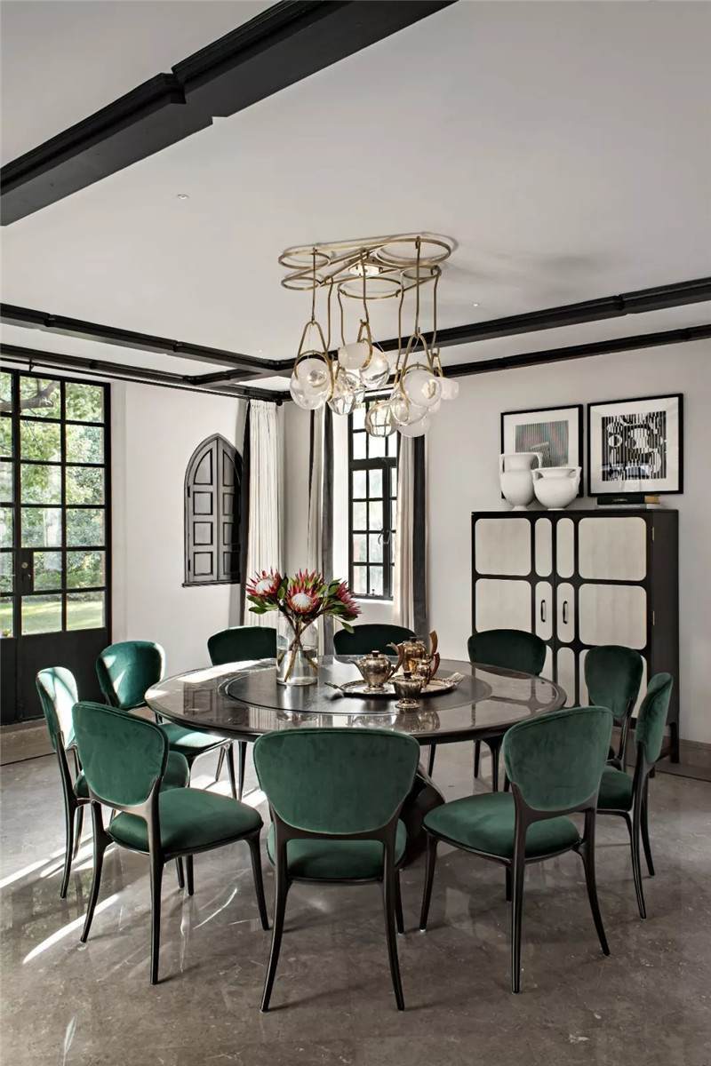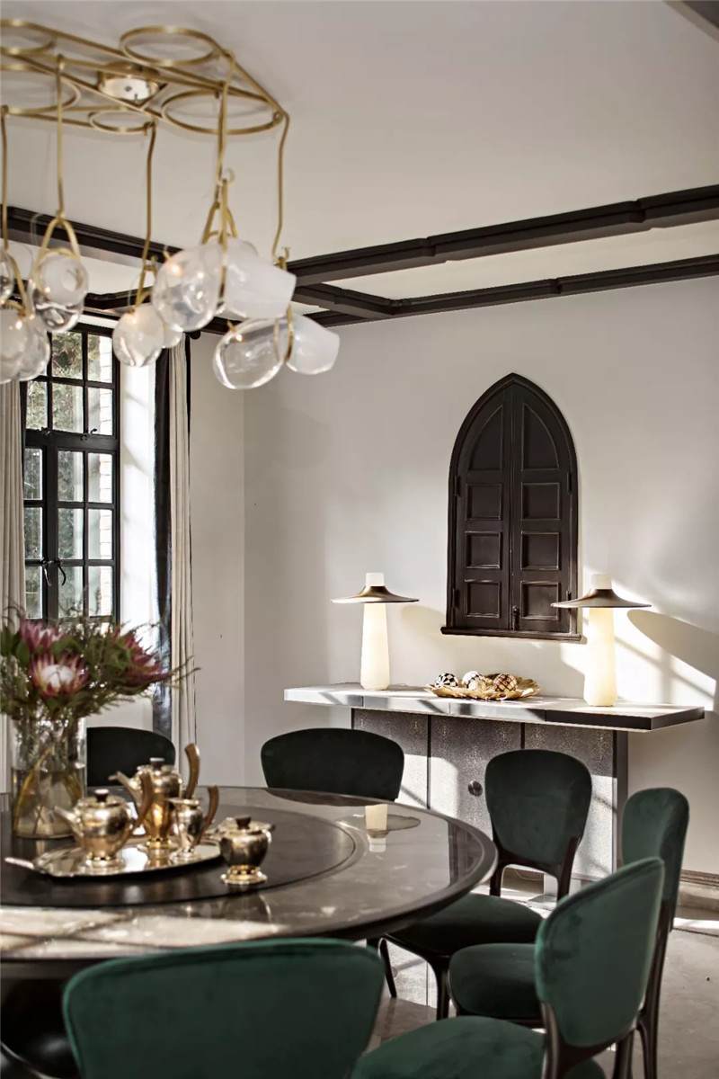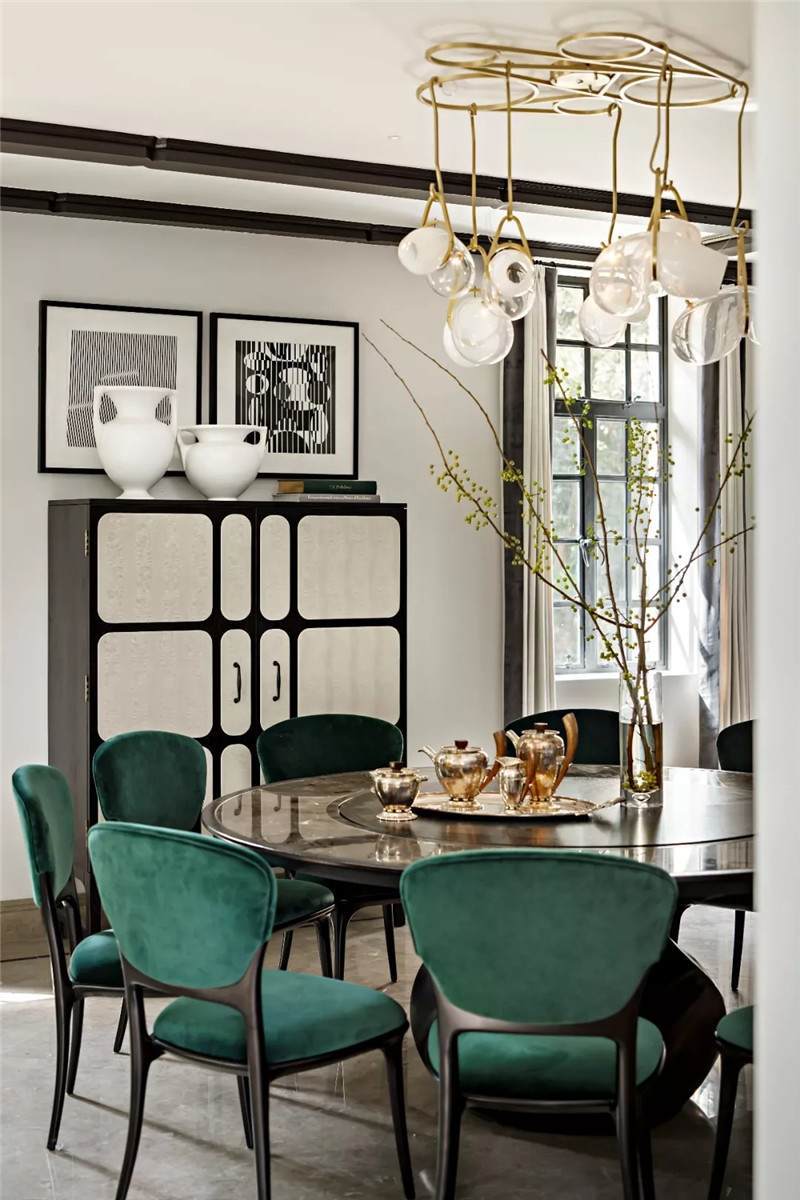 設(shè)計師在開放式餐廳匯入尊貴的墨綠色,這也是拉斐爾前派畫家但丁·加百列·羅塞蒂畢生鐘愛的顏色。它溫情而清醇,神秘中帶著些許明朗,似幽深林間漫溢出的一屢清泉,在海派復(fù)古格調(diào)中自在游暢。