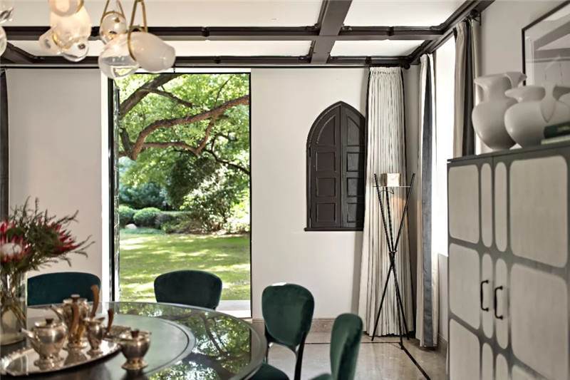 別墅設(shè)有多處入口,隨意打開便是綠意盎然的私家庭院,伴隨著陽光將自然靈氣帶入室內(nèi)。室外旁斜逸出的樹木枝條與室內(nèi)的裝飾橫梁恰好相得益彰,完美銜接成一處花園景致,讓人身處別墅宛若進(jìn)入到馨香田園之境。
