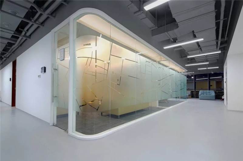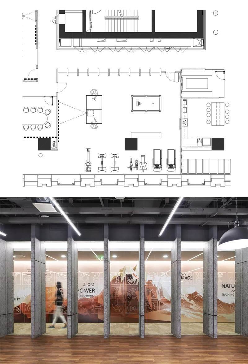 健身房采用的是隔墻類的隔斷,透過隔墻隔斷玻璃能看到核心筒的走道,核心筒的墻面是一幅大型的噴繪畫,結(jié)合立體字,畫面比較震撼,再通過健身房往外看就會產(chǎn)生非常豐富的層次感。玻璃隔斷上也有小的磨砂圖案,形成了戲劇性的效果,使空間的層次更加突出。