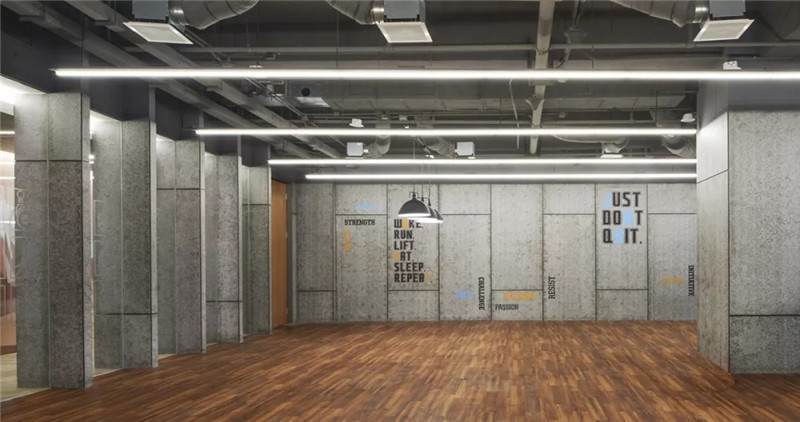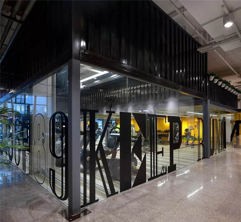 整體空間設(shè)計多層次,所以它的貼膜采用黑色字母來呈現(xiàn)健身區(qū)的氛圍。