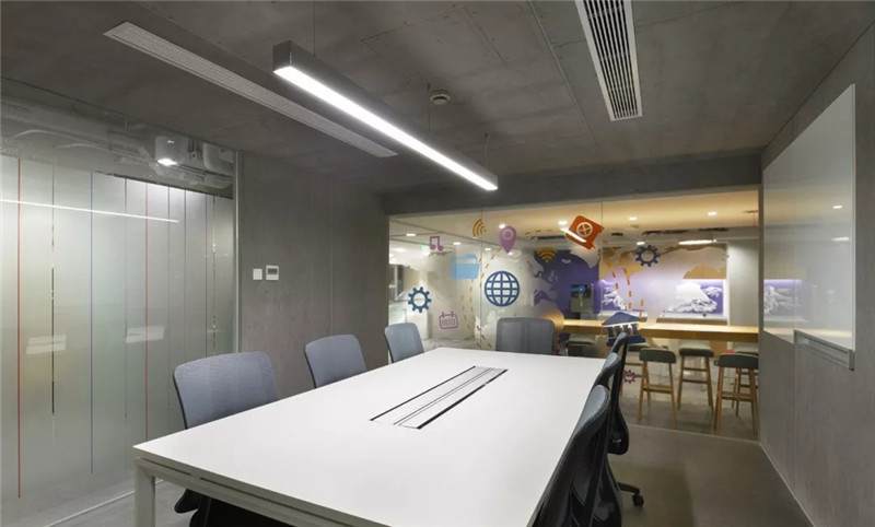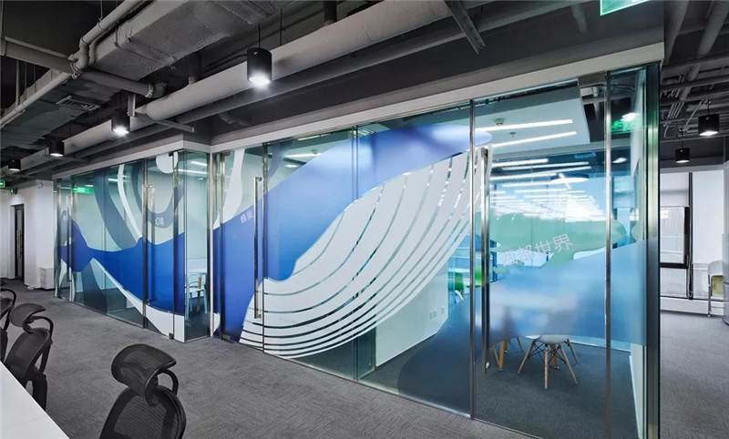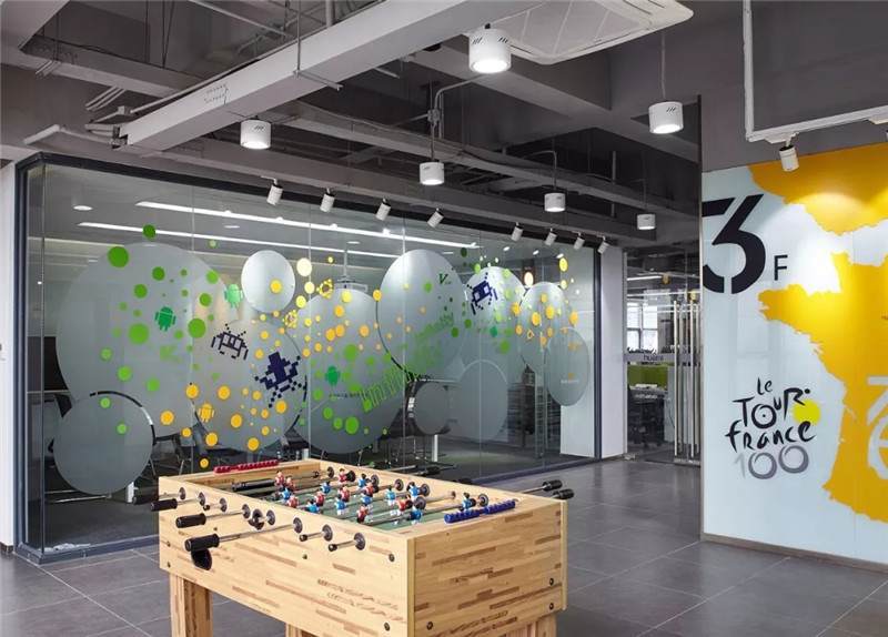 第二張中可以看到,桌上足球,這一張是會議室的玻璃貼膜,最初設(shè)計的都是一些彩色的圓點,但是做完后太通透,起不到遮擋作用,所以現(xiàn)場臨時在玻璃的內(nèi)側(cè)又加了大型的磨砂圓,就有兩層疊加到一起的圖形,磨砂與色彩組合在一起,效果豐富有層次。