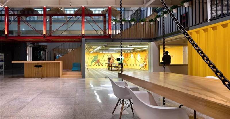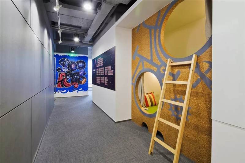 比如這張圖,也是華米科技北京的辦公室,用奧松板開兩個洞,精巧可愛的睡眠艙趴在墻上,利用兩個洞把它組成了自行車的輪廓,超萌的壁畫使墻面不再單一,色彩的對比更加直觀,同時用太空艙的形式增添趣味點,不論是做設(shè)計師還是做工匠,都要秉持設(shè)計的理念去進行選材和制造工藝,把握好每一個細節(jié)。