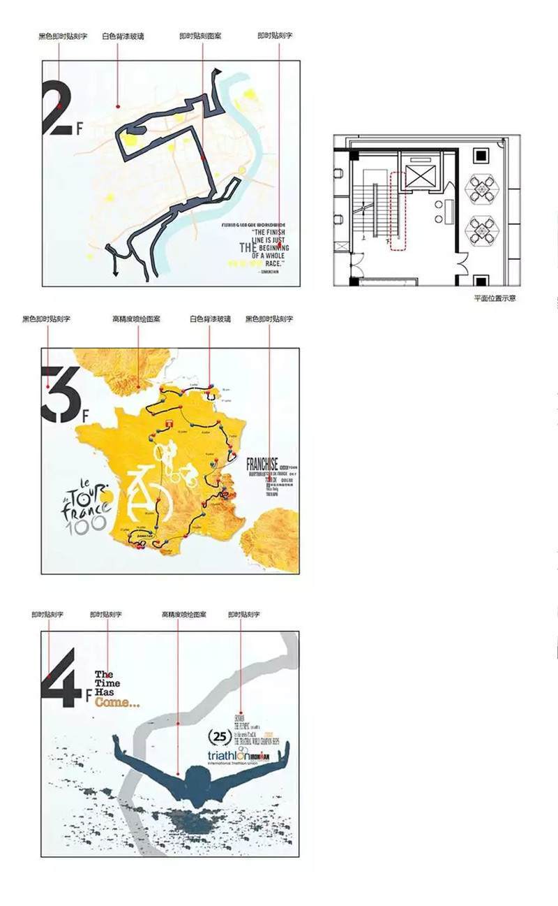 軟裝部分,這是幾層的設(shè)計稿,不同樓層的導(dǎo)視結(jié)合圖案以及主要的背景墻的主題。當時的設(shè)計文件實際的完成效果可以看出跟之前的設(shè)計稿基本上是完全一樣的,設(shè)計的時候也是因為都是用的矢量文件1:1的設(shè)計小稿,所以能保證完成后的效果。