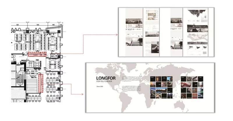 這一部分內(nèi)容跟展示設(shè)計相似,例如上圖,龍湖集團辦公室內(nèi)的一些項目展示團隊的建設(shè),利用了大面積墻面上的空間進行了設(shè)計和制作。