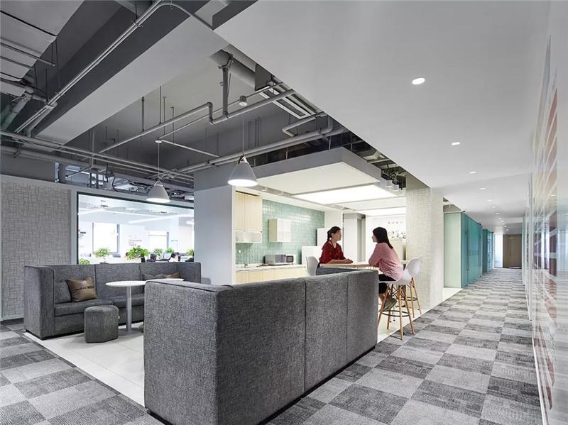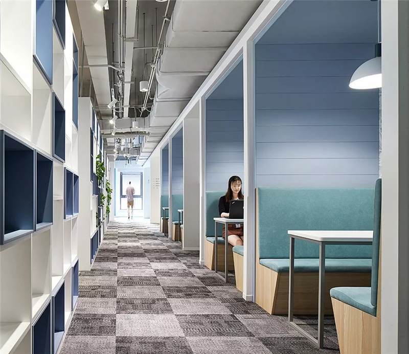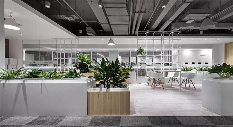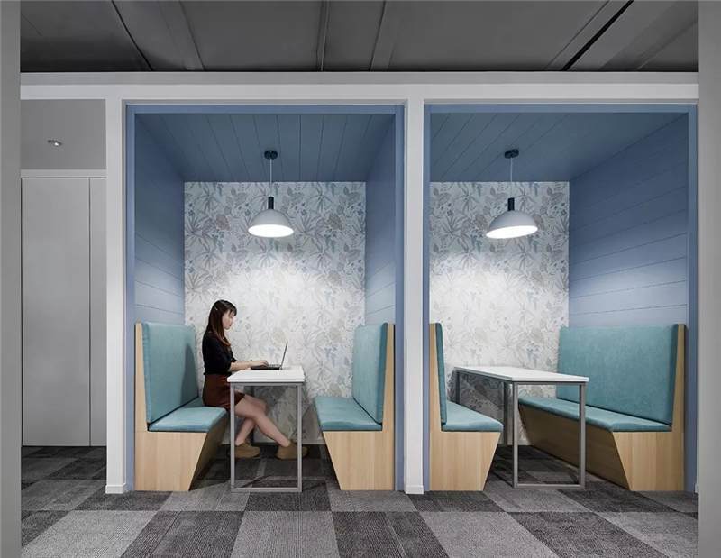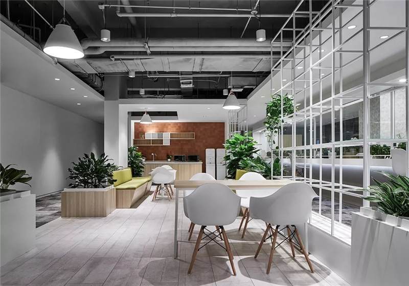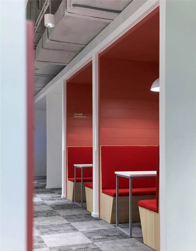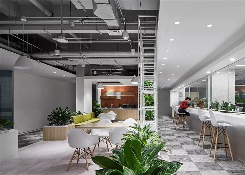 3-6層的各事業(yè)部及旗下子公司辦公層,設(shè)計(jì)師沿著核心筒打造環(huán)形的公共區(qū)域及溝通環(huán)廊帶,依次布置開放休憩洽談區(qū),電話亭,小型會(huì)議室,茶水間,衛(wèi)生間,涂鴉板等促進(jìn)溝通交流但界限模糊的混合功能區(qū),并采用卡座,綠植,通透金屬框架,玻璃配以貼膜,墻貼等方式營造公共區(qū)域與辦公區(qū)之間的多層次關(guān)系,形成自由穿梭的辦公空間動(dòng)線。