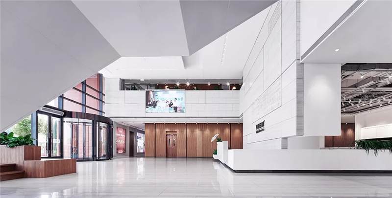 前廳大堂采用高挑空結(jié)構(gòu),用大尺寸純色人造石雕刻工藝打造前臺及LOGO背景墻,背景墻后設(shè)置墻體與東易日盛高端家裝高科技產(chǎn)品一體化展示區(qū),右側(cè)設(shè)置白色穿孔鋁板樓梯配以彩色階梯直達(dá)二層展廳,樓梯平臺以木飾面板點(diǎn)綴綠植打造成休憩待客區(qū),整個(gè)大堂接待區(qū)營造出現(xiàn)代,開放,包容的氛圍。