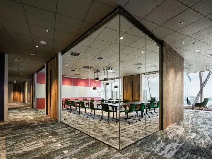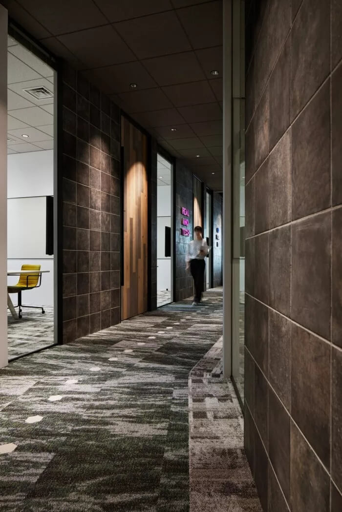 為此,設(shè)計團隊的目標是讓辦公室成為一個人們隨便可以咨詢房地產(chǎn)相關(guān)資訊的地方。入口處有許多綠植,寬敞的空間看起來比起居室還要舒服。辦公室配備了帶有防污圖案的框架,復(fù)古吊燈和帶有當(dāng)下流行風(fēng)格的霓虹燈標注,徹底改變房地產(chǎn)公司的傳統(tǒng)形象??臻g約有3300平方米,擁有20多件會議室,員工使用的公共空間介于工程師和代理商空曠的工作間之間。