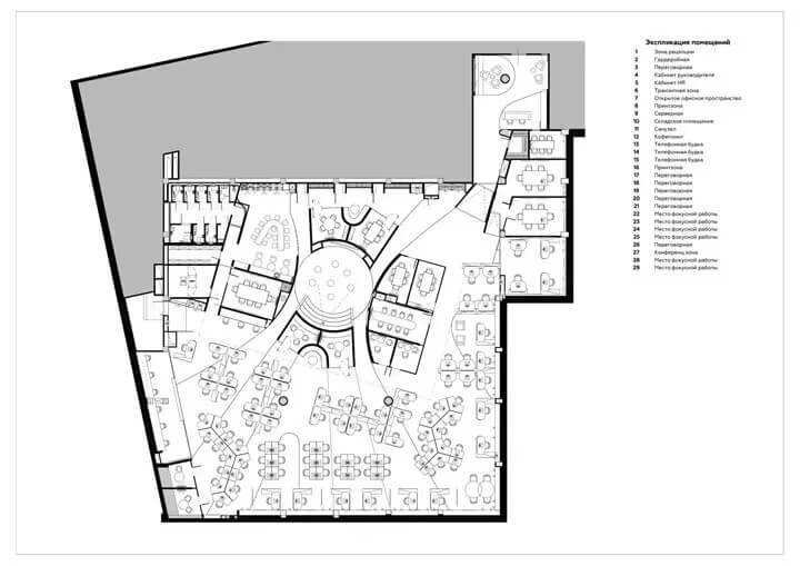 計概念的靈感來源于公司的名稱——L'or(法語,意為gold金色)和aurele(法語,意為halo光環(huán))。“金色光環(huán)”的品牌寓意成為整個空間形式的構(gòu)造背景,整個辦公室的主動線也圍繞著一個圓環(huán)來規(guī)劃。這個中心圓環(huán)被定義為一個明亮的核心空間,形成一個中心會議大廳,周邊分布著或開放或封閉的會議區(qū)。