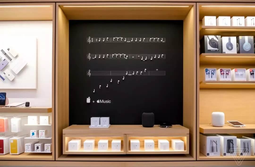 該店鋪內(nèi)重新設(shè)計了攝影大道,其背景墻適用于新款手機(jī)的拍照測試,這里也是世界上第一個開設(shè)專門展示AirPods的大道的商店。