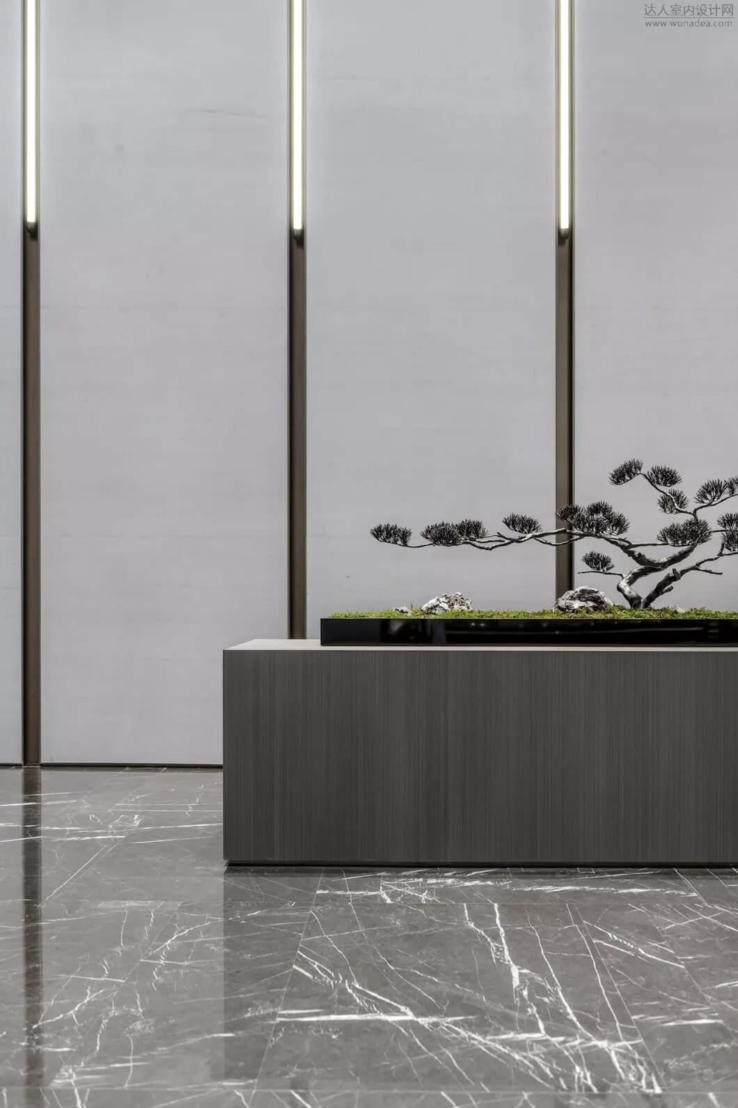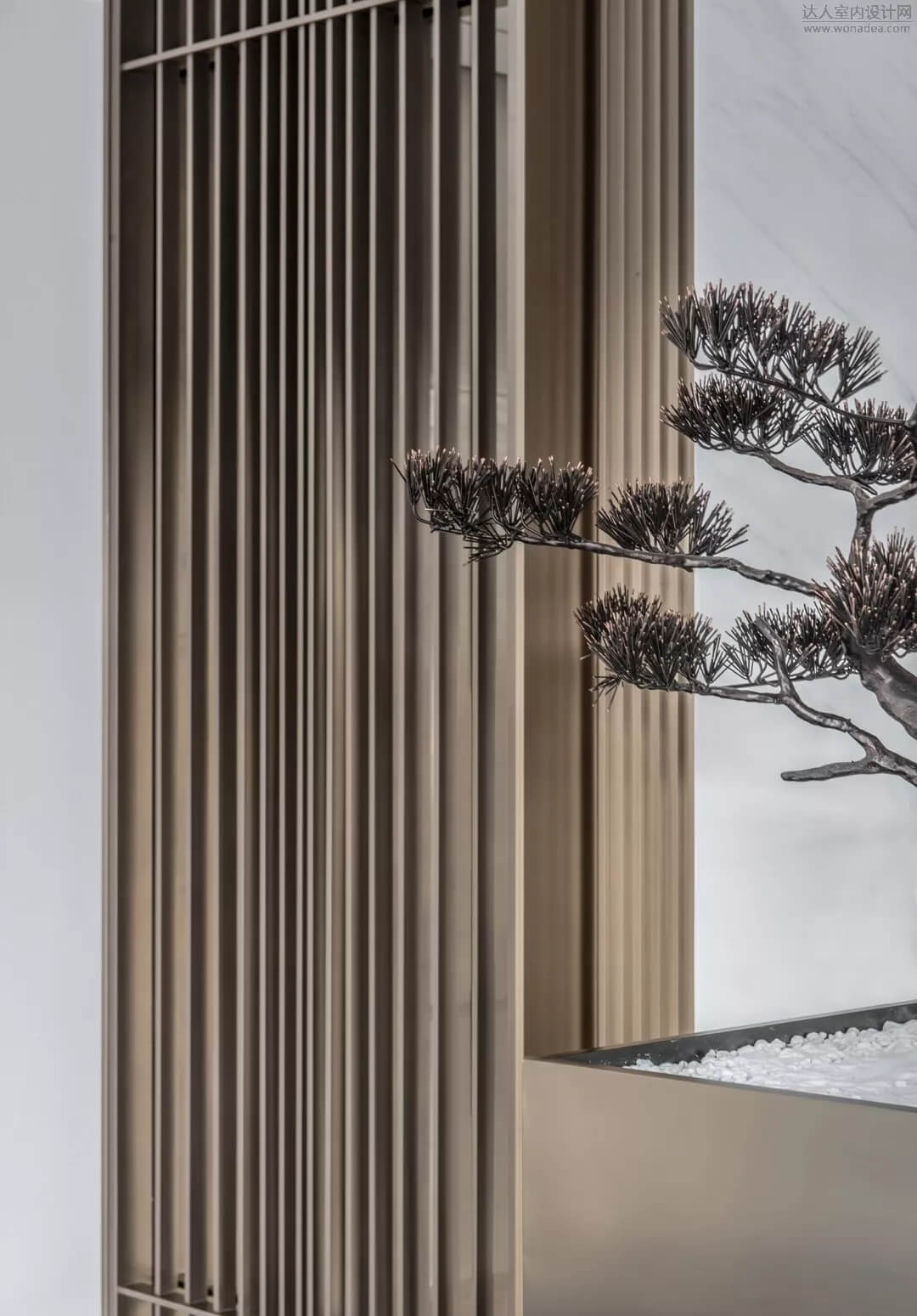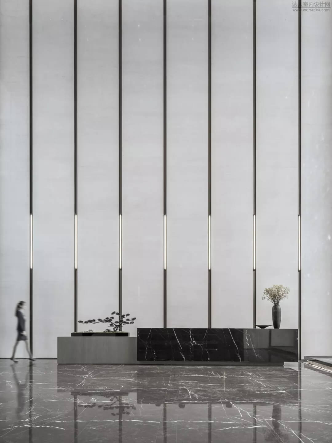通過豐富的景觀區(qū)進(jìn)入門廳,感受到空間的空靈,立面設(shè)計過濾了來自于外界的繁復(fù)。十米挑空的大廳,墻面以米色砂巖為基底,黃銅色金屬強(qiáng)化縱向的比例,凸顯出空間的氣勢。入口對景設(shè)置的水景讓穿梭其中的訪客仿若能傾聽到潺潺水聲,同時水景和懸掛的軟裝裝置相得益彰,充滿巧妙的用意,同時也分隔了挑高通透的玻璃幕墻,虛實結(jié)合,體現(xiàn)現(xiàn)代設(shè)計的東方神韻。