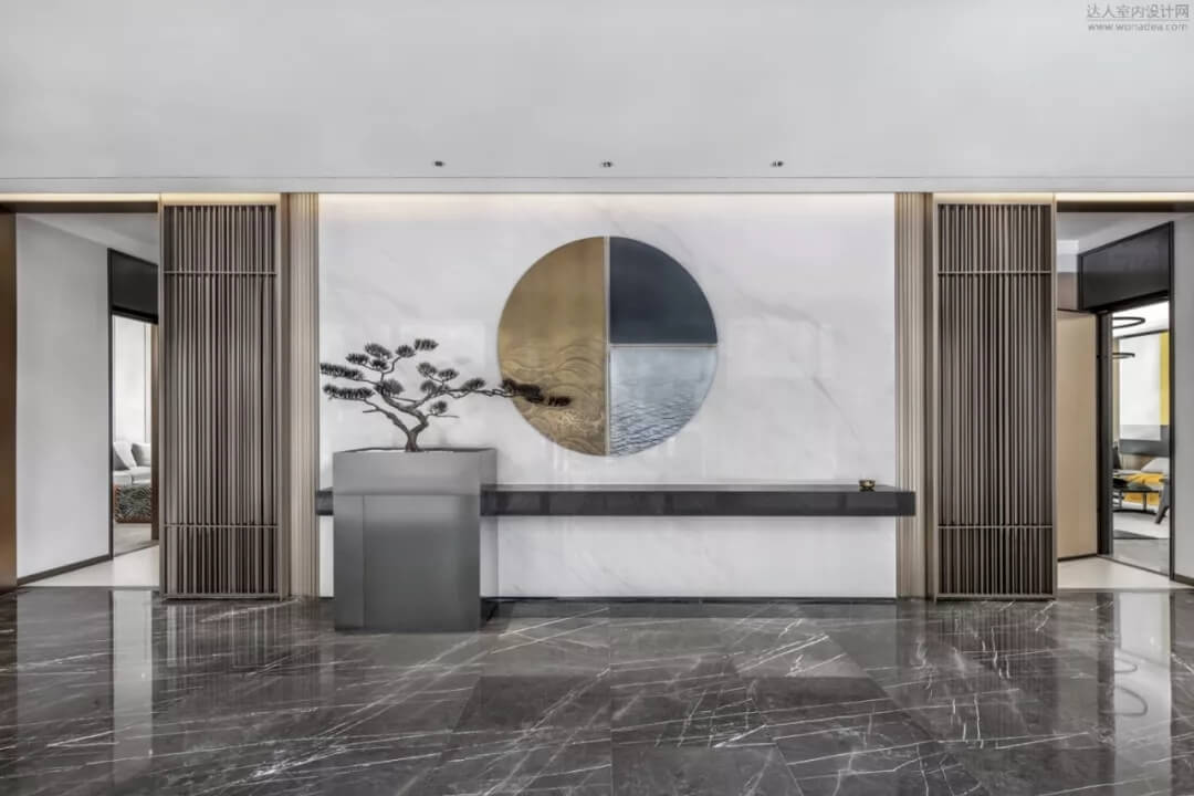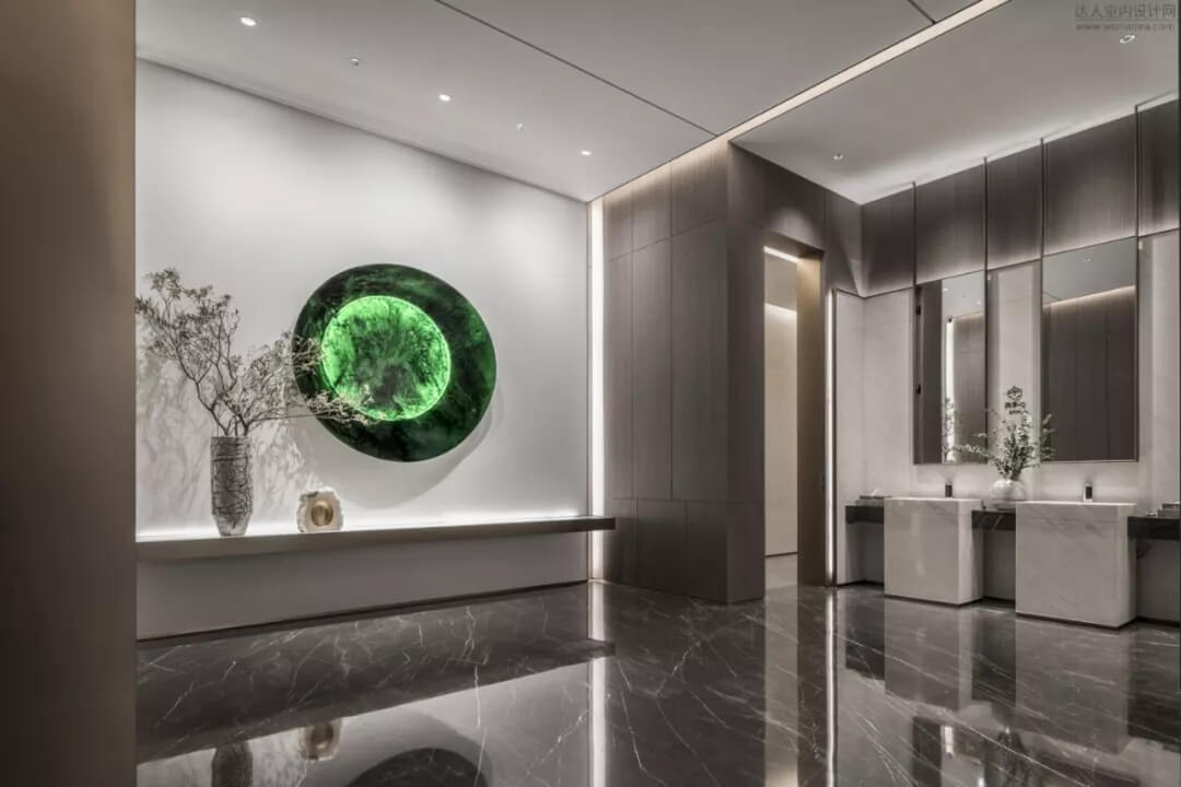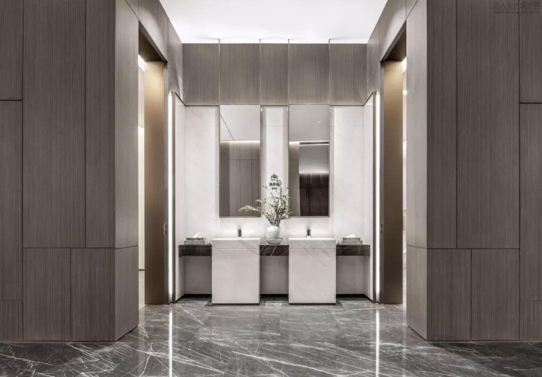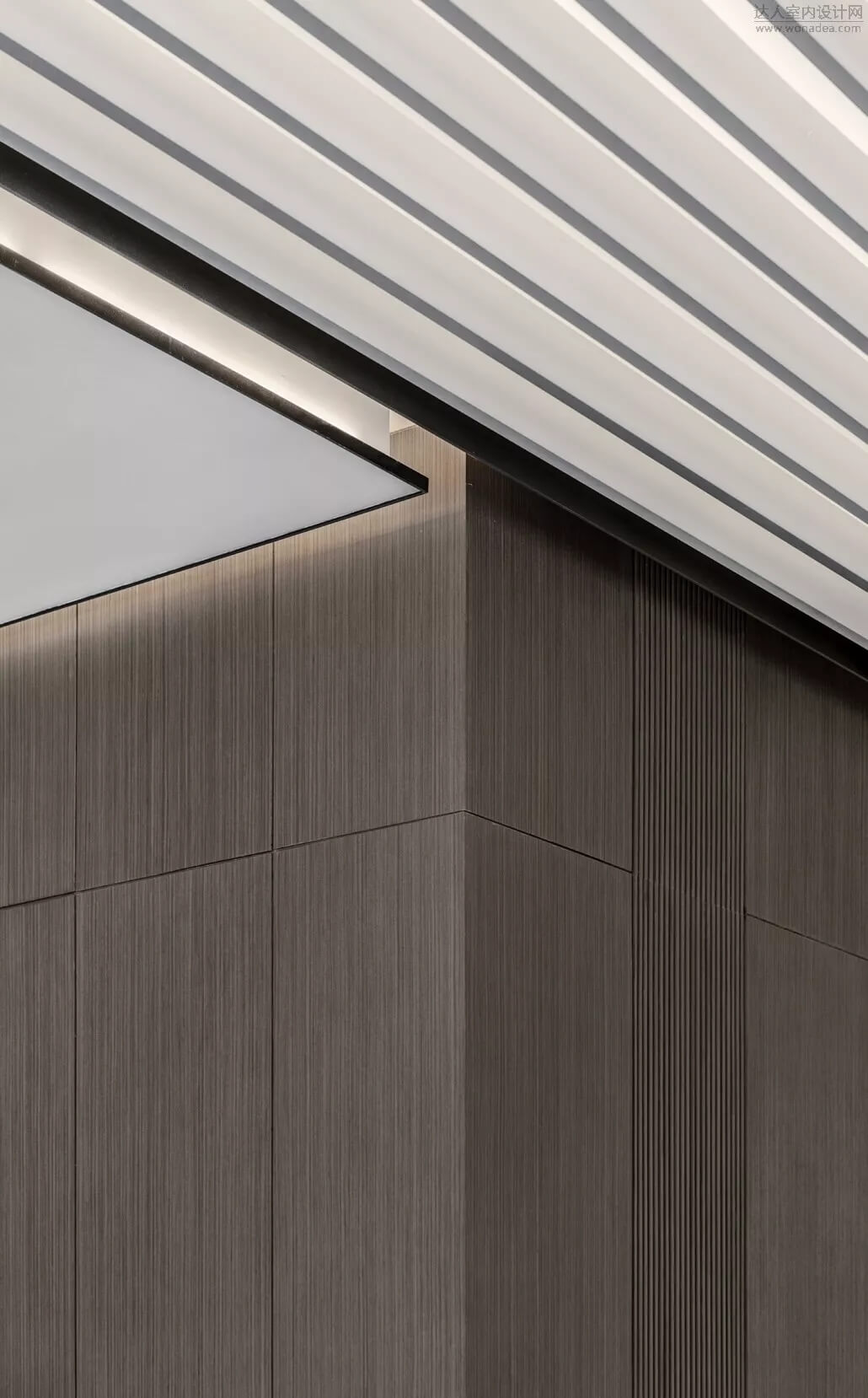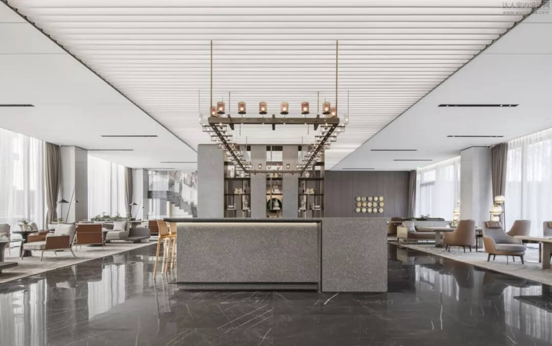 通過豐富的景觀區(qū)進(jìn)入門廳,感受到空間的空靈,立面設(shè)計過濾了來自于外界的繁復(fù)。十米挑空的大廳,墻面以米色砂巖為基底,黃銅色金屬強(qiáng)化縱向的比例,凸顯出空間的氣勢。入口對景設(shè)置的水景讓穿梭其中的訪客仿若能傾聽到潺潺水聲,同時水景和懸掛的軟裝裝置相得益彰,充滿巧妙的用意,同時也分隔了挑高通透的玻璃幕墻,虛實結(jié)合,體現(xiàn)現(xiàn)代設(shè)計的東方神韻。