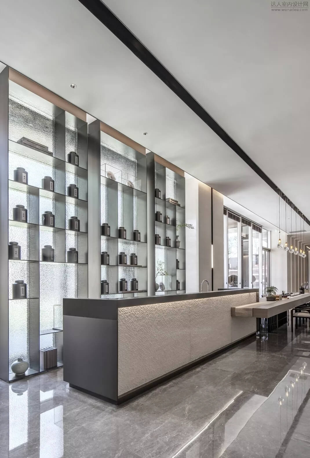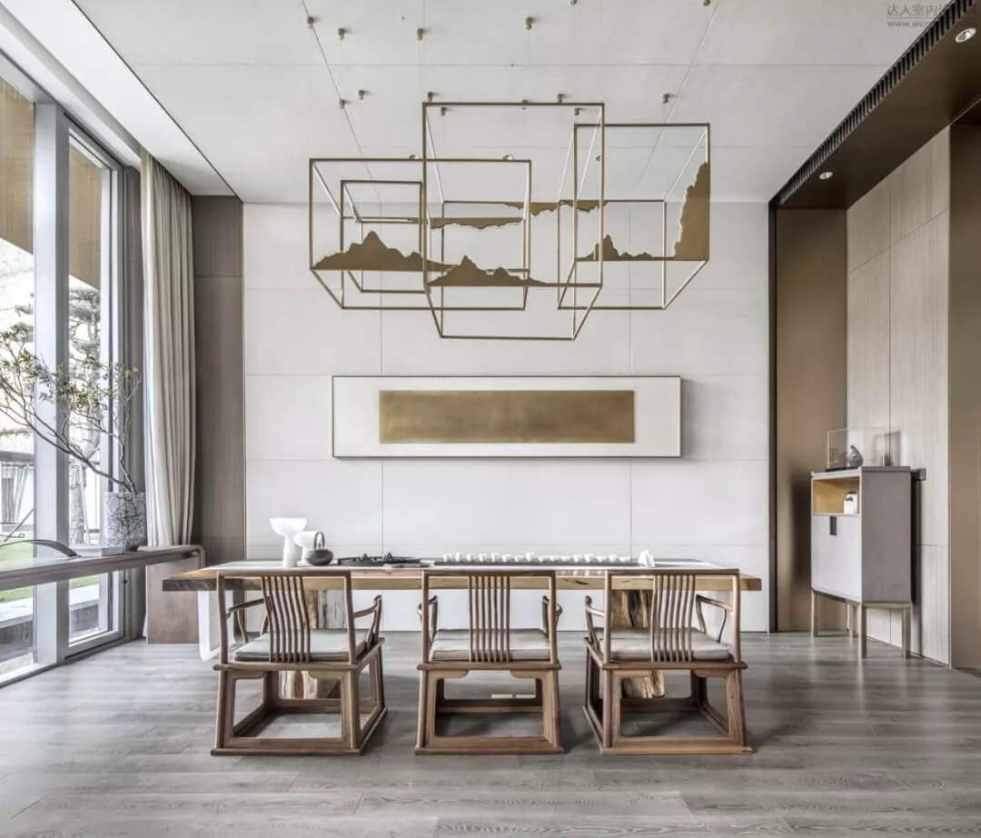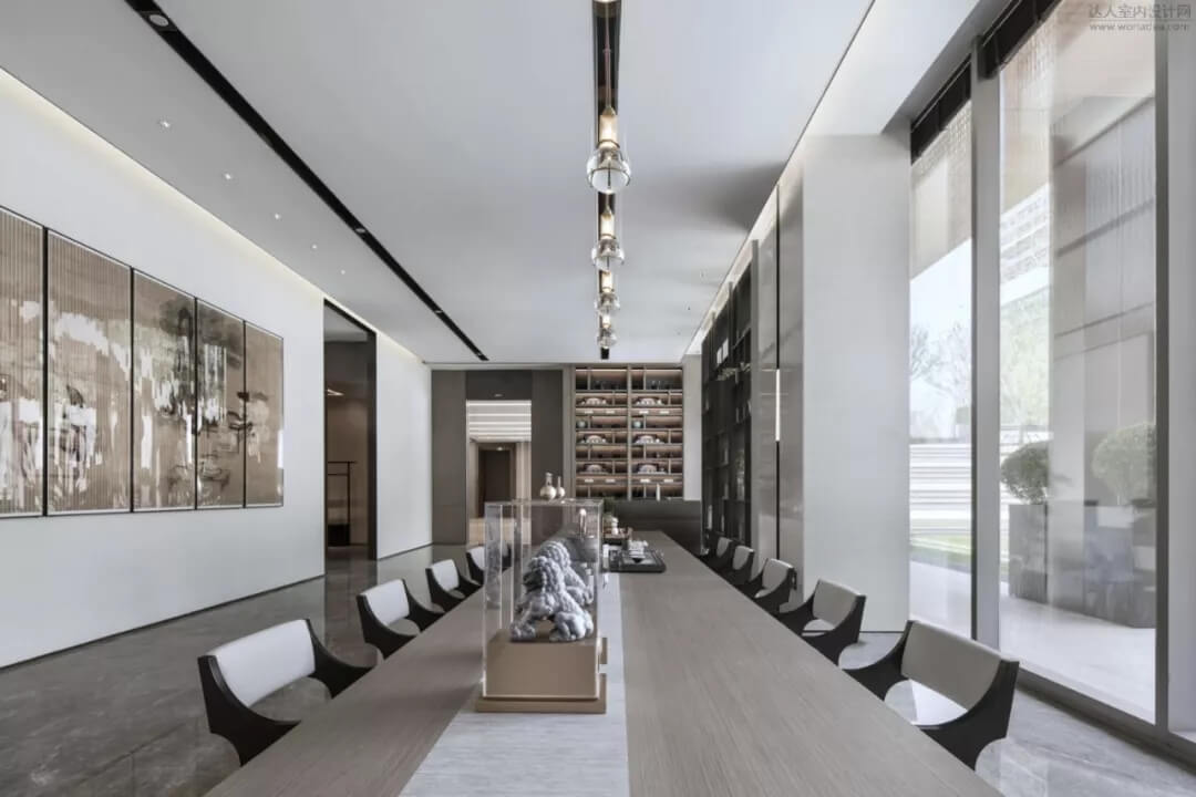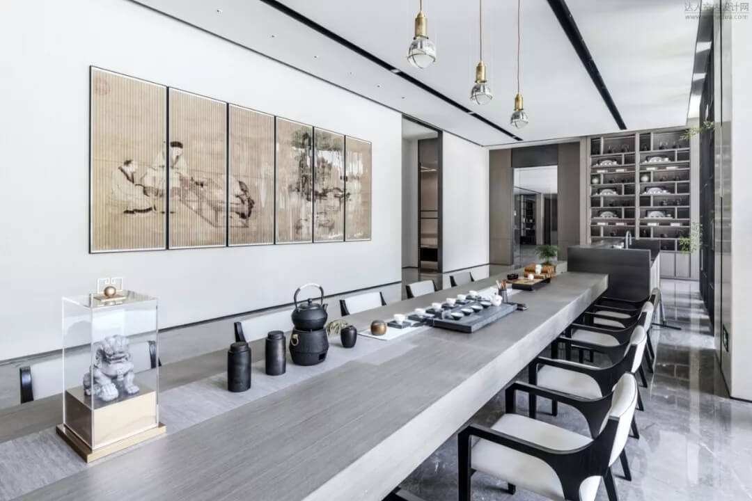 在會所品茶水吧臺區(qū)結(jié)合枯山水造景,色彩雅致內(nèi)斂,充分展現(xiàn)了中國人素來喜愛的‘靜’,同時超長條的品茶臺,利用下沉庭院的景觀和室內(nèi)產(chǎn)生了互動,模糊了室內(nèi)外的界限。藝術(shù)儀式感的空間給人帶來思考的余地。