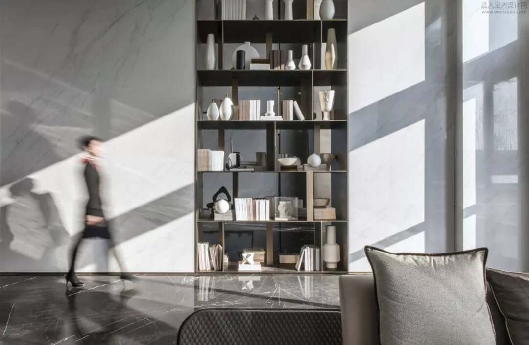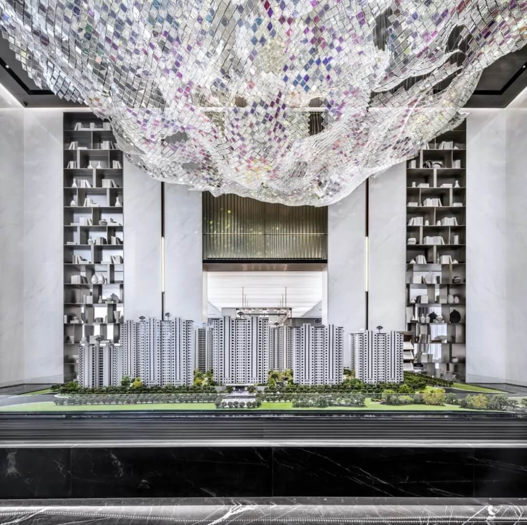 沙盤區(qū)墻面以大花白陶瓷板為主墻面,通過通高的黃銅書架體塊和金屬格柵,本身空間具有很強(qiáng)的中軸對稱的儀式感,凸顯出空間的大氣。曼妙的波浪曲線,以流動的韻律打破空間靜態(tài),同時從明亮空靈的大堂走入半圍合的沙盤區(qū),總能給人帶來新奇感,亦是詩意與藝術(shù)的格調(diào)升華。