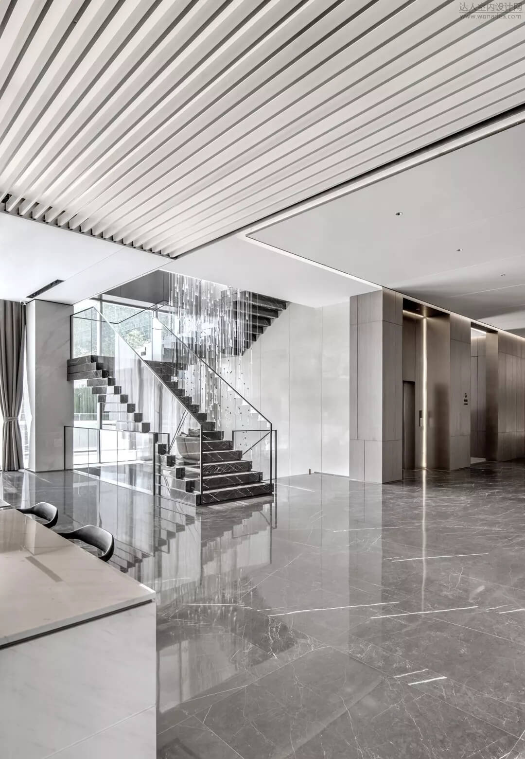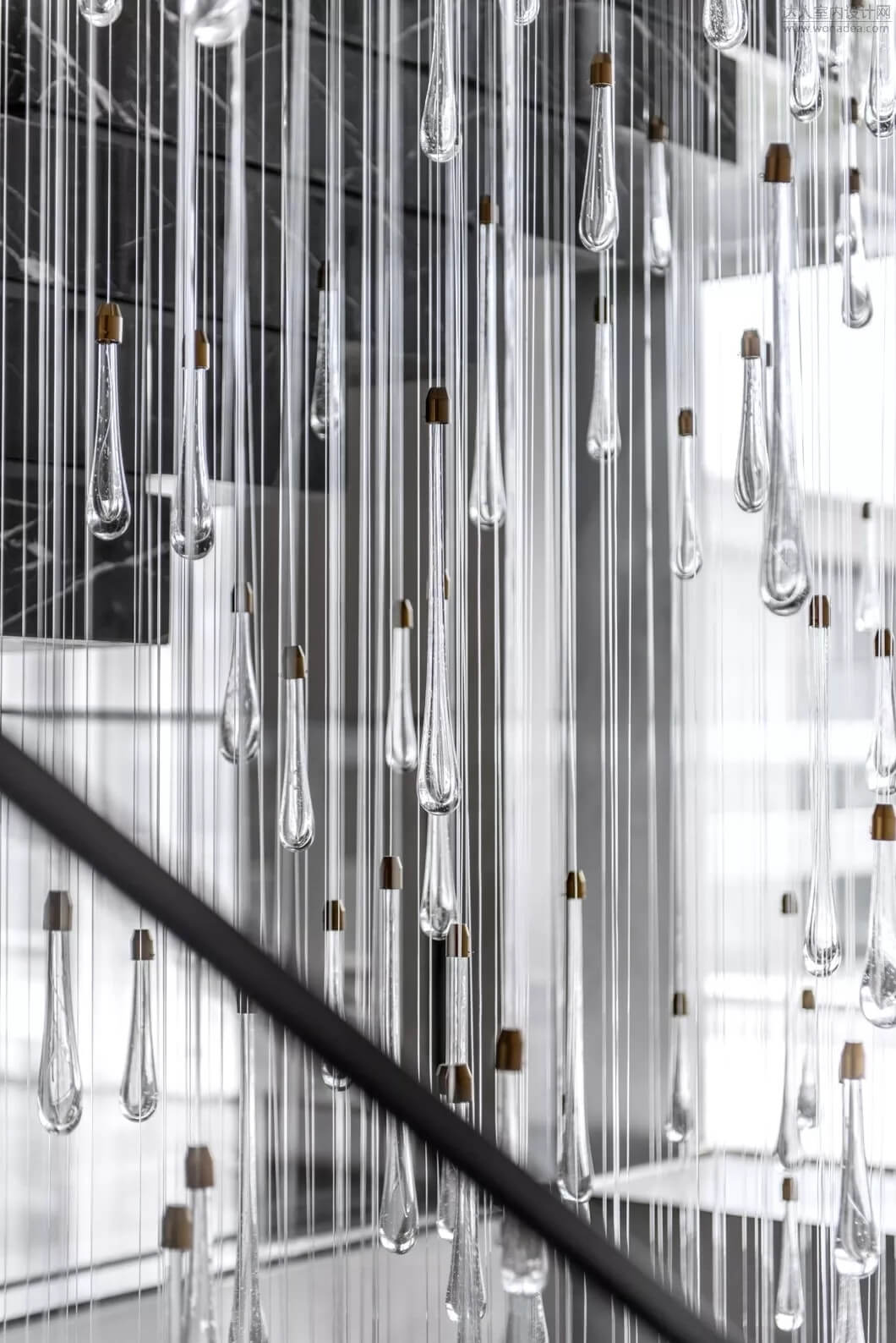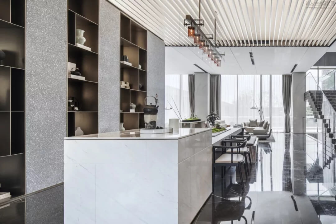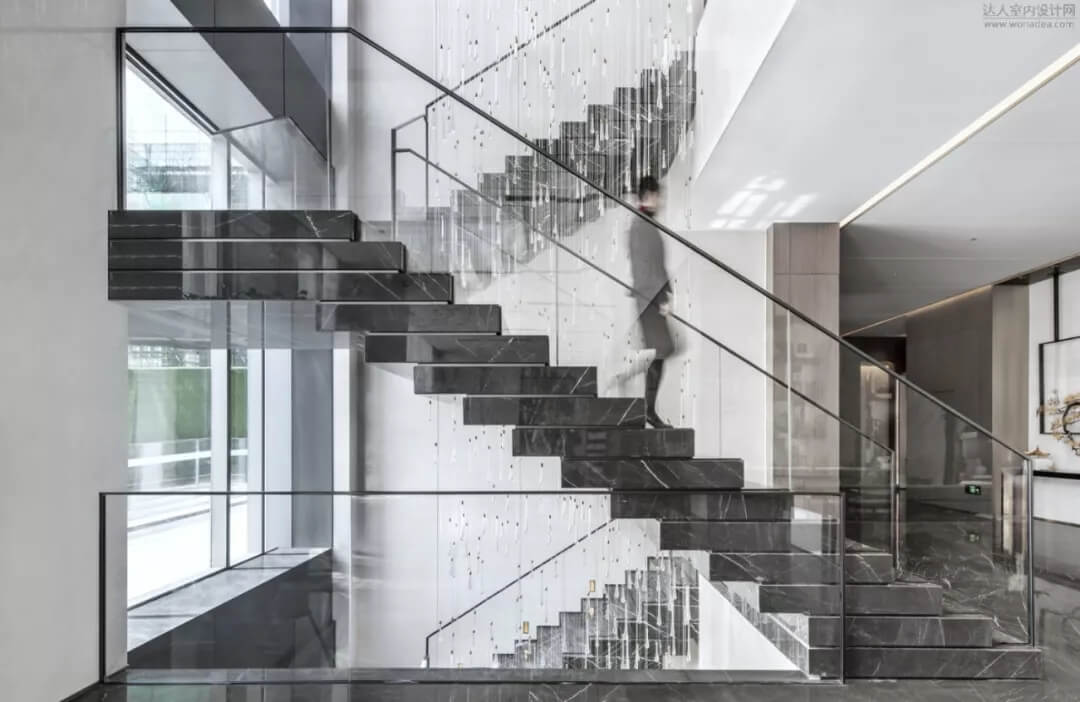 樓梯在空間中不僅是能上下的建筑物,將它打破序列重新解構(gòu),輕盈且厚重,構(gòu)成如雕塑般的能量,讓它成為連接售樓處和會所的藝術(shù)裝置。樓梯的鮮明特質(zhì)在精心設(shè)計下顯得非常令人矚目,結(jié)合樓梯下面的水景,讓空間賦有東方意境。