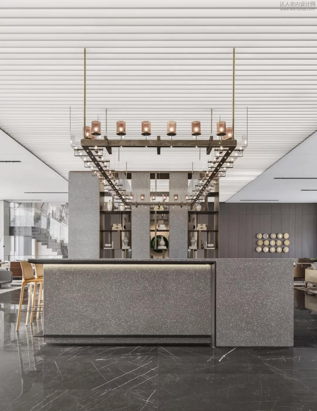 進(jìn)入洽談區(qū)大廳,通過大面積全明落地玻璃窗,最大程度地將室外的建筑、景觀效果納入室內(nèi)視野,以觀景式空間概念記錄時移景易的歲月縮影。圍合形的水磨石吧臺猶如藝術(shù)裝置,成為空間的中心焦點。