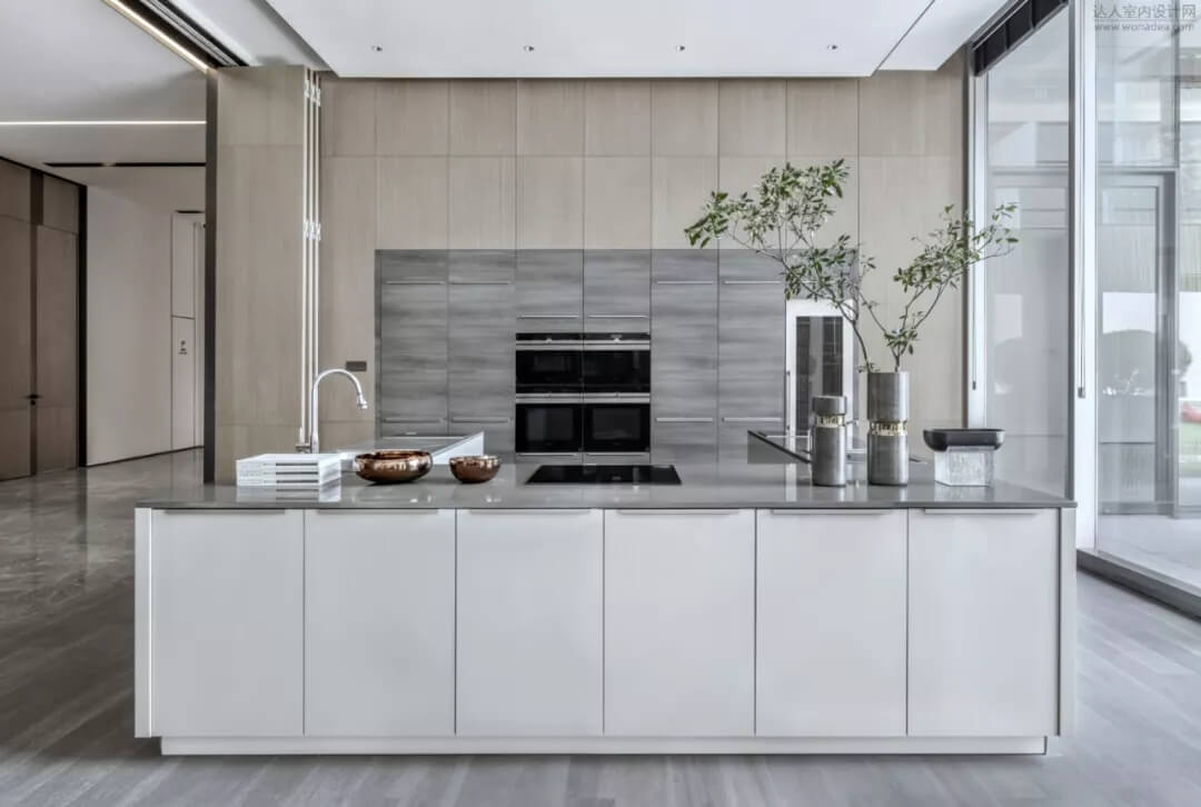 私宴,是以當(dāng)代設(shè)計來描繪文人飲酒時追求的清雅意境,寄情於山水??臻g通過折疊門和西廚吧臺區(qū)產(chǎn)生互動,空間功能既獨立又有相互滲透。延續(xù)簡潔流暢的線條,布置與空間密切配合。