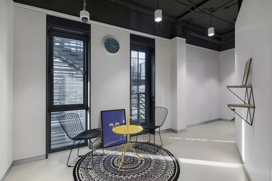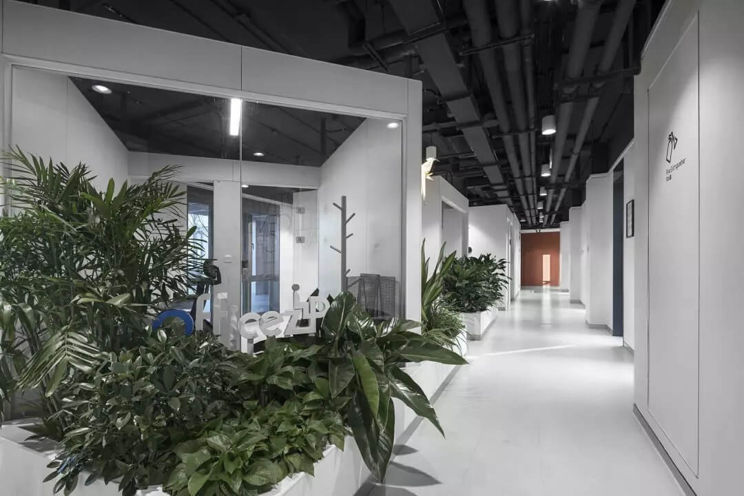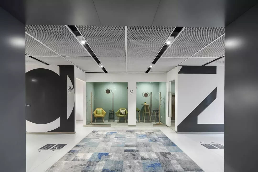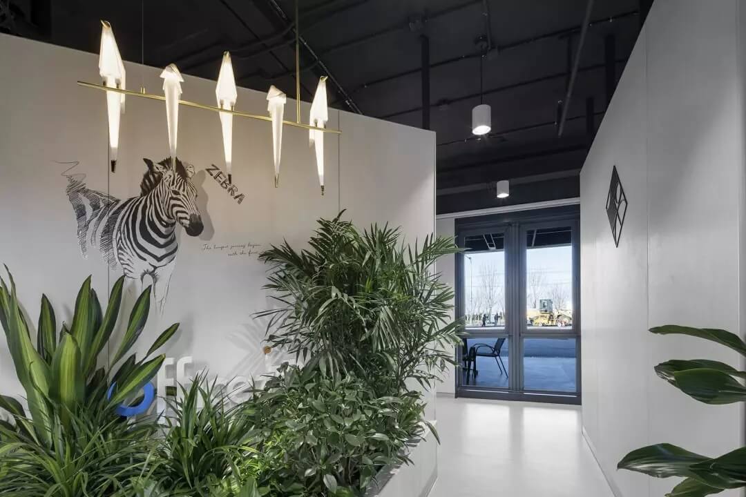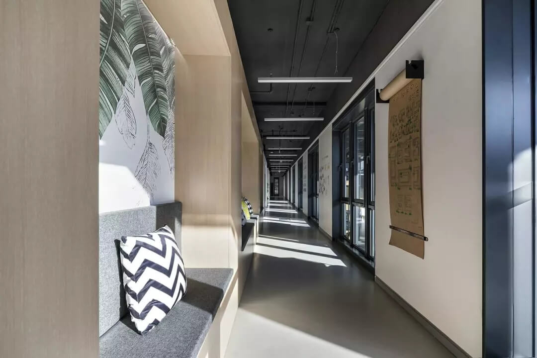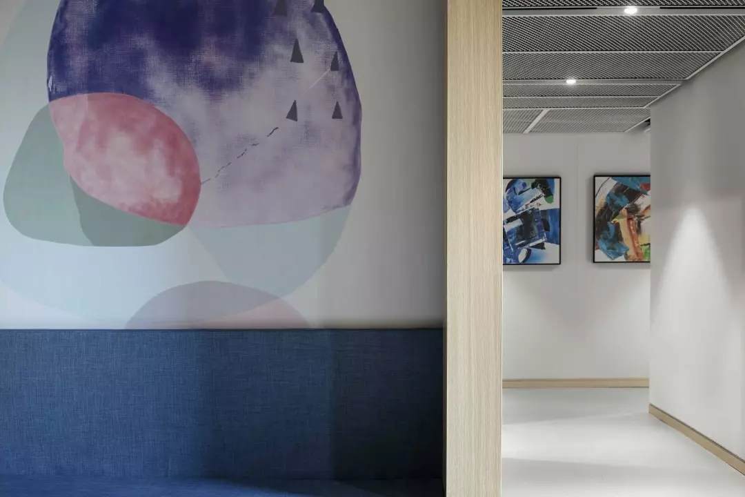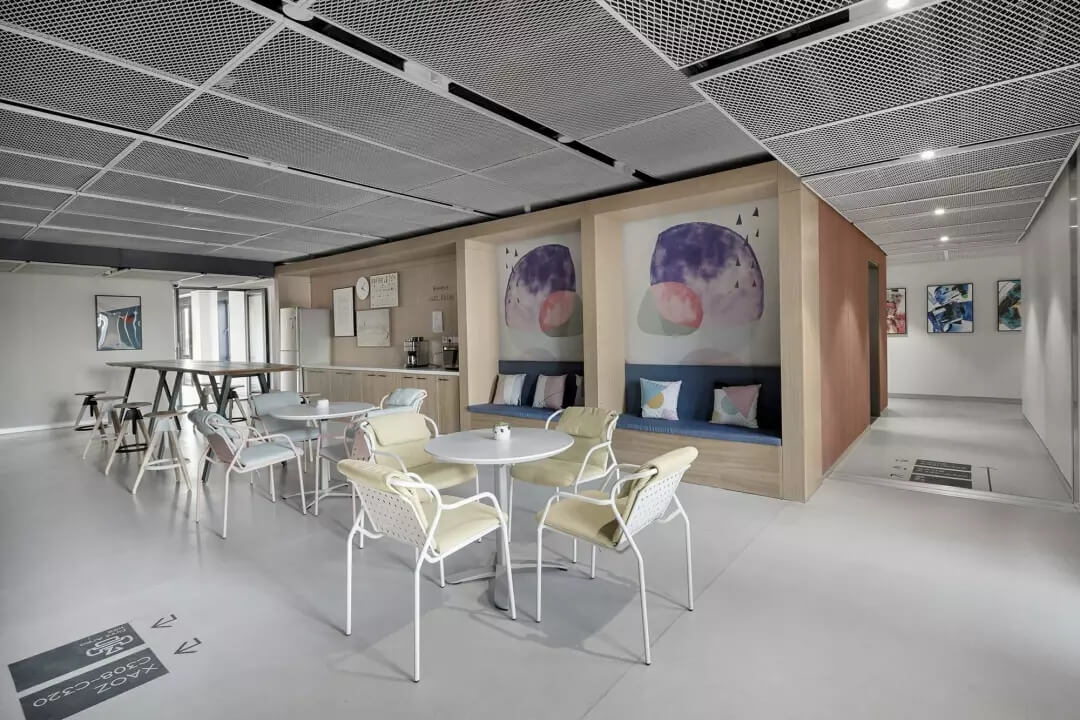 至于盒子以外的空間,我們想凝聚更多的人文藝術(shù)氣息,選擇較多地去鋪陳展示各種抽象的藝術(shù)線(xiàn)條和畫(huà)作,同時(shí)為了不失去生活氣息,各個(gè)角落選擇顏色比較跳躍的家居什物,讓它作為一個(gè)流動(dòng)的戶(hù)外廣場(chǎng),讓人可以自在穿行其中,偶爾停駐觀(guān)察,經(jīng)得住人聲鼎沸的喧擾,亦能提供心靈靜憩的安寧。在這里,大家認(rèn)真辦公、生活、盡情交流、分享,它就是一個(gè)安放綠意,有極高包容度的公共空間。