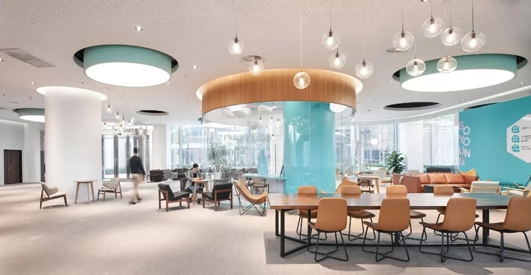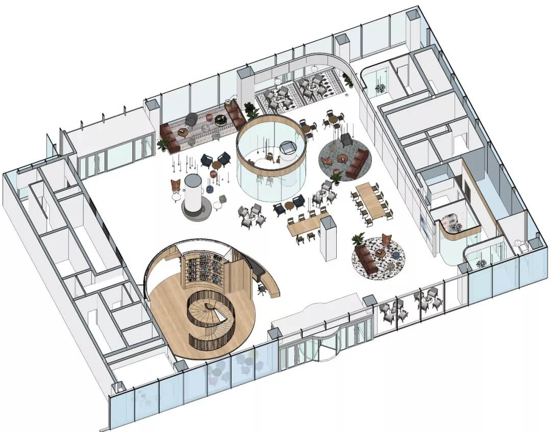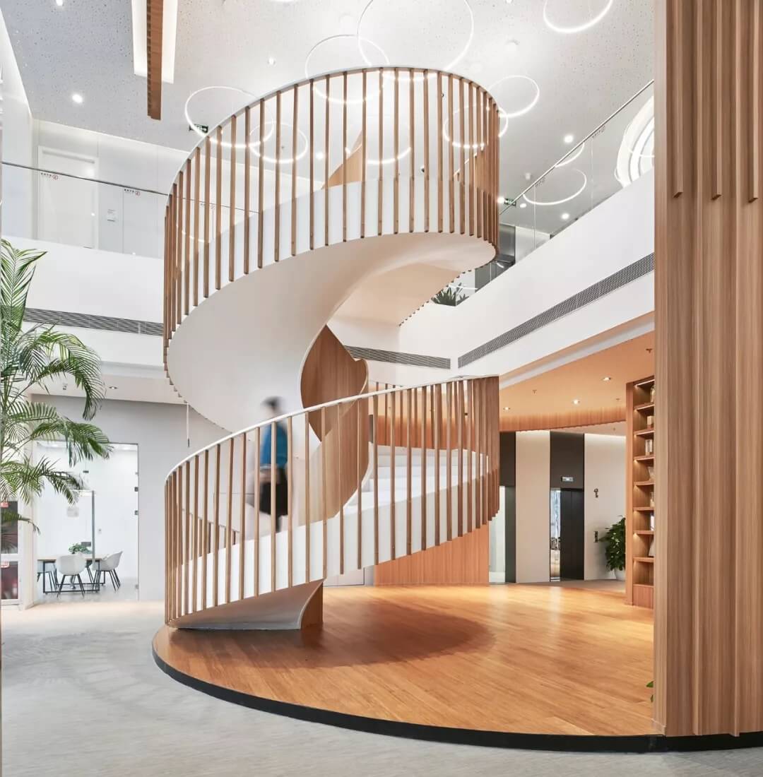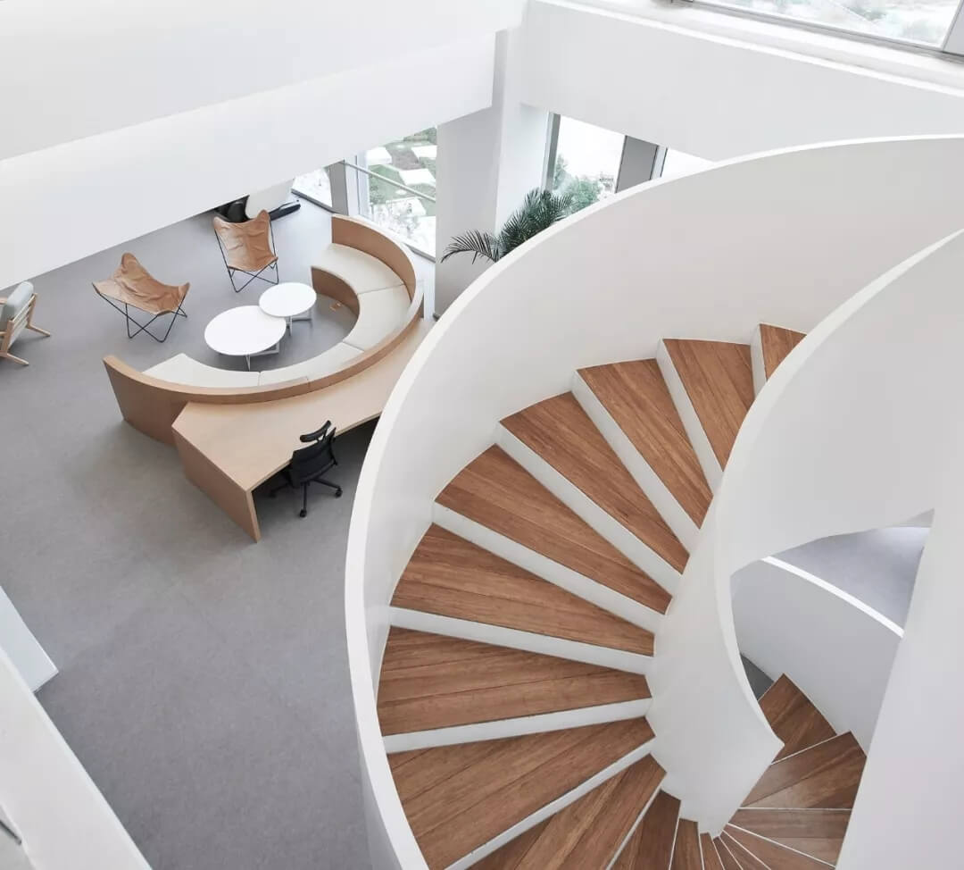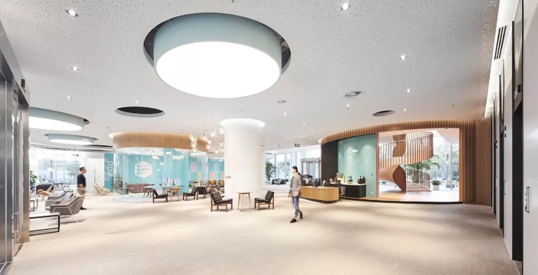 都市客廳島,選擇流暢線條的螺旋樓梯貫穿上下,運(yùn)用條形面板錯縫排列成弧形的照明方式,使整個空間照度均勻,且條形面板亦可作為裝飾展示面。家居軟裝選用極簡風(fēng)格,流線組擺方式,營造自由靈活的空間,促進(jìn)員工間的交流和溝通。