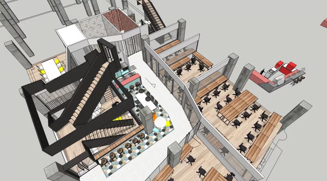 整個(gè)空間最大的視覺(jué)中心便是中庭里那個(gè)“刻意”彰顯存在感的樓梯,優(yōu)美的弧線激發(fā)并引導(dǎo)著大家探索上層空間的欲望。在最初的方案中,它其實(shí)并不是曲線,而是剛毅的直線,我們認(rèn)為直線的迷人在于它的簡(jiǎn)單、坦誠(chéng),棱角分明且封閉的做法讓它如雕塑一般矗立。