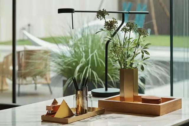 利用建筑層高優(yōu)勢(shì),在沙盤區(qū)上方創(chuàng)造層次豐富、光影虛實(shí)變化的幾何造型,強(qiáng)化空間錯(cuò)落感。通過動(dòng)軸引伸便是洽談區(qū)。設(shè)計(jì)方案不希望洽談區(qū)和接待區(qū)域過于直接,通過造景形式將兩個(gè)空間自然串聯(lián)并分割開來。花藝在靜水面的映射下,光與影默契配合,有效避免了接待臺(tái)前的空曠,也營(yíng)造出了整體空間的美學(xué)秩序。