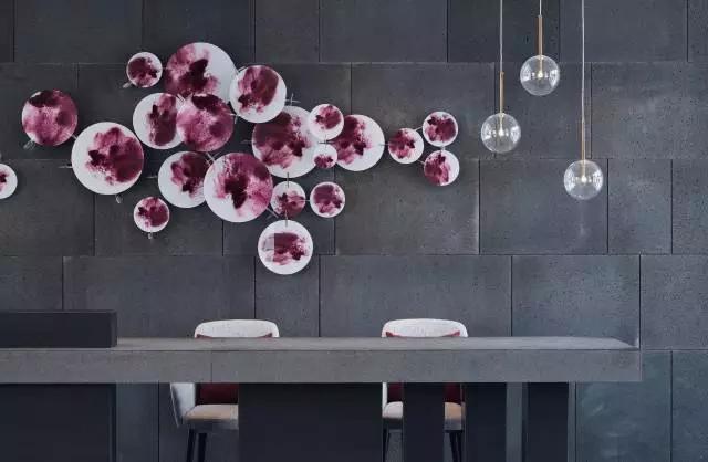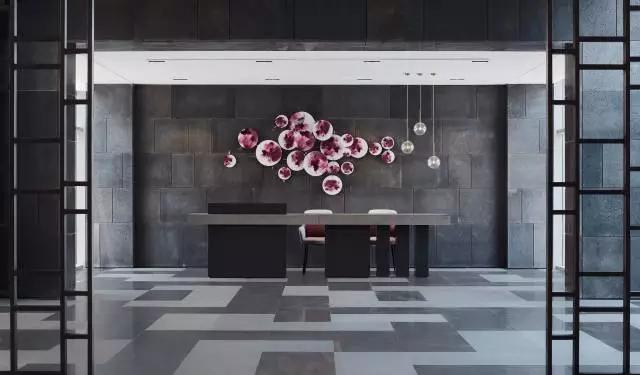 預(yù)接待吧臺(tái)與大廳講究整體的對(duì)稱平衡,通過巧妙的吧臺(tái)構(gòu)成形式、空間吊燈的位置,呈現(xiàn)靈動(dòng)的立面關(guān)系,有效緩解空間的呆板。大面積深灰色石材,配以紫色壁飾花瓣式鋪灑開來,夾雜一絲神秘感,東方韻味無限彌散。