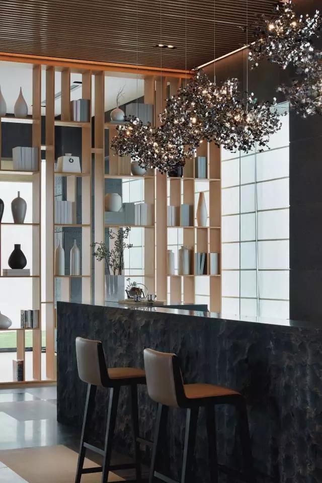 水吧臺(tái)以毛鑿面的形式呈現(xiàn),質(zhì)樸卻別具一格。而光線透射在吧臺(tái)頂面,又與書架、吊燈以及頂部的木百葉形成互動(dòng),勾勒出繽紛的空間輪廓。粗獷肌理感的石材,又與花瓣式的吊燈形成材質(zhì)上的鮮明對(duì)比,晶瑩璀璨。
