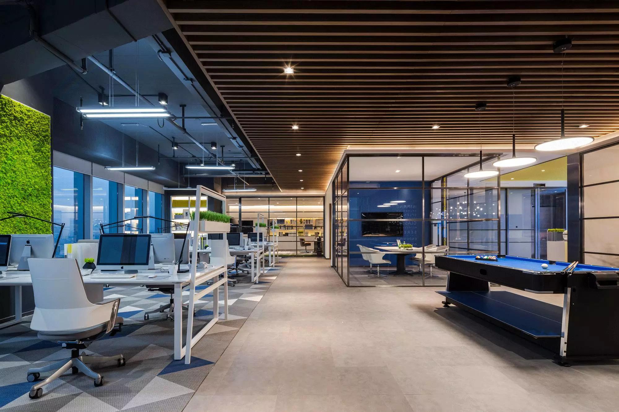 裸露的天花與木格柵的設(shè)計,形成反差,重點突出了原建筑的空間感,與時下設(shè)計熱點相適應(yīng);臺球的細(xì)節(jié)設(shè)計,體現(xiàn)了公司對員工精神層面上的關(guān)懷,工作之余,還可打一桿臺球放松身心。
