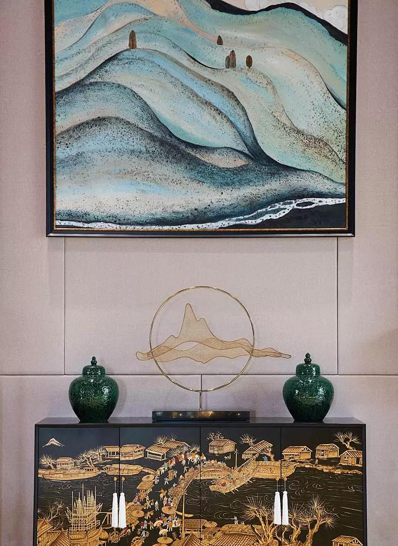 “湖光山色”項(xiàng)目位于西安歷史遺址觀光帶上,毗鄰鎬京遺址公園與斗門水庫(kù),四周環(huán)境怡然靜雅,歷史文化氣息濃厚,近期其營(yíng)銷中心已完工,軟裝設(shè)計(jì)交由深圳印象空間呈現(xiàn)。結(jié)合周圍環(huán)境及甲方需求,印象空間最終將西安古都情懷融于作品中,于細(xì)微之處傳遞意境之美。