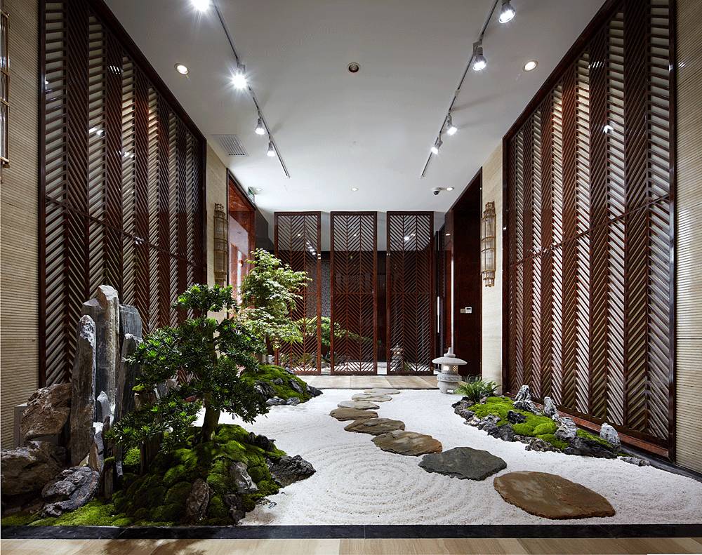 值得一提的是,走廊干景步道的景觀軟裝,一個(gè)集觀賞、生態(tài)、自然于一體的設(shè)計(jì)。小巧石籠、粒徑不等的灘石,旱濕均可培植的苔草地被,有機(jī)地組合在一起傳遞古樸自然的審美趣味,讓營(yíng)銷中心的意境之美濃郁幾分。