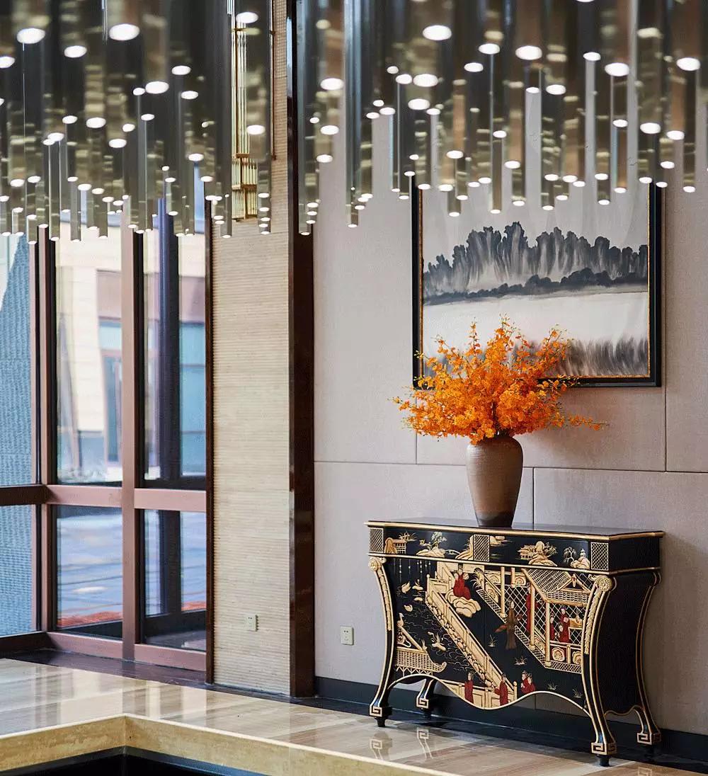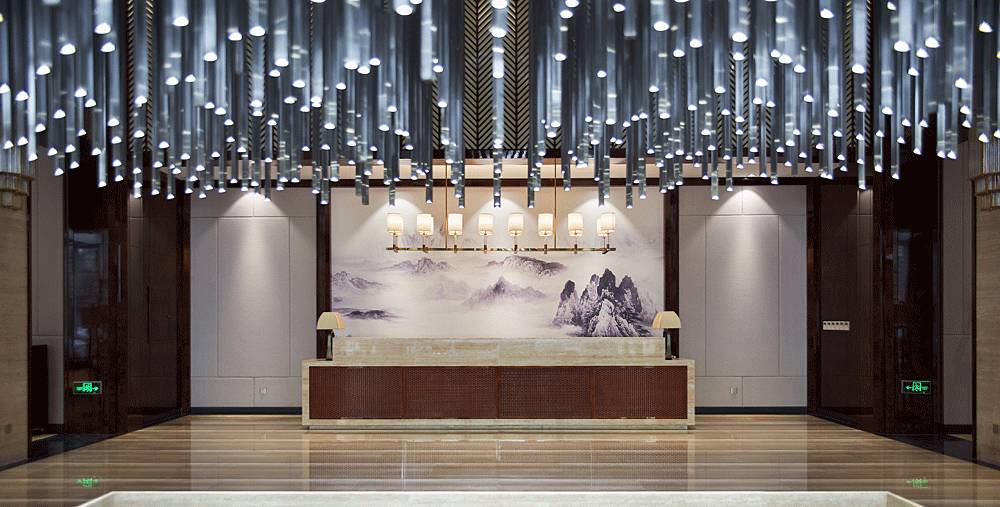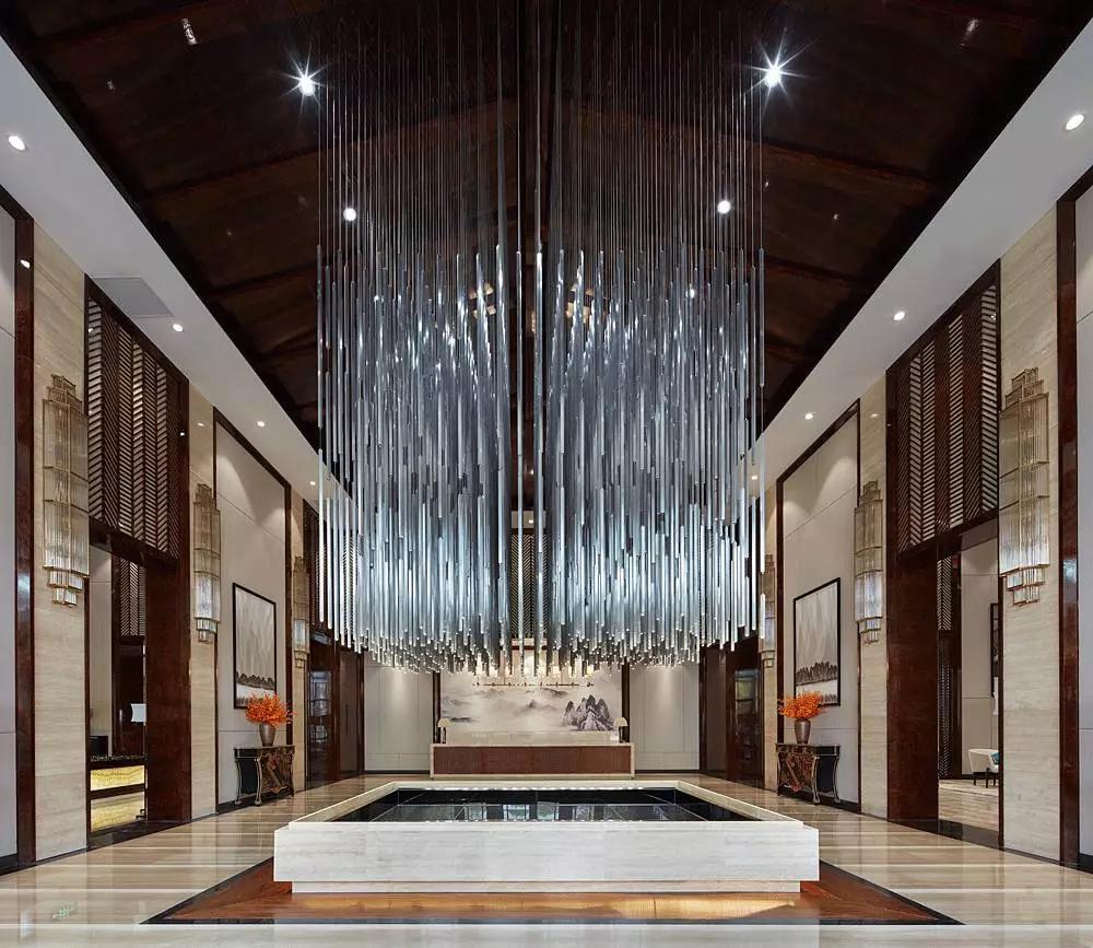 進(jìn)入大堂中心,便被一個(gè)奪人眼目的裝置藝術(shù)吸引,數(shù)百根不銹鋼條垂吊而下,宛如瀑布“飛流直下三千尺,疑是銀河落九天”,成為整個(gè)空間的視覺(jué)焦點(diǎn),啟動(dòng)后,水珠從不銹鋼滴落到地景的水中,呈現(xiàn)出“大珠小珠落玉盤(pán)”的動(dòng)感。