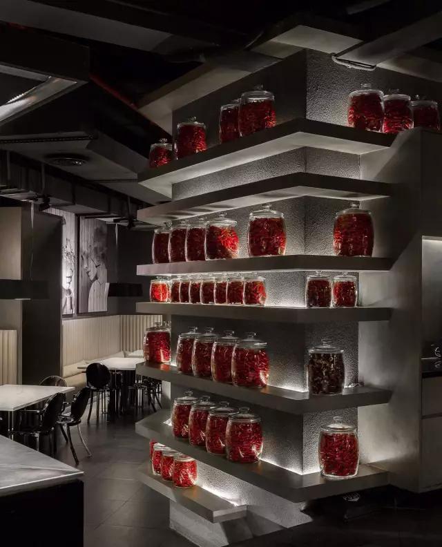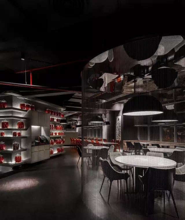 小辣椒湘菜餐廳空間,是以空間的多樣性為主軸。餐廳創(chuàng)始人提出以辣椒裝飾空間,設計師通過對“小辣椒”這個設計字符的不斷重復,給空間增加藝術畫及創(chuàng)意燈飾,成為空間裝飾的細節(jié)。整個空間的體量不算特別大,但有下沉式空間設計。用于分割空間的雨滴式珠簾,似動而靜的雨滴隔斷簾營造親密又放松的用餐空間。