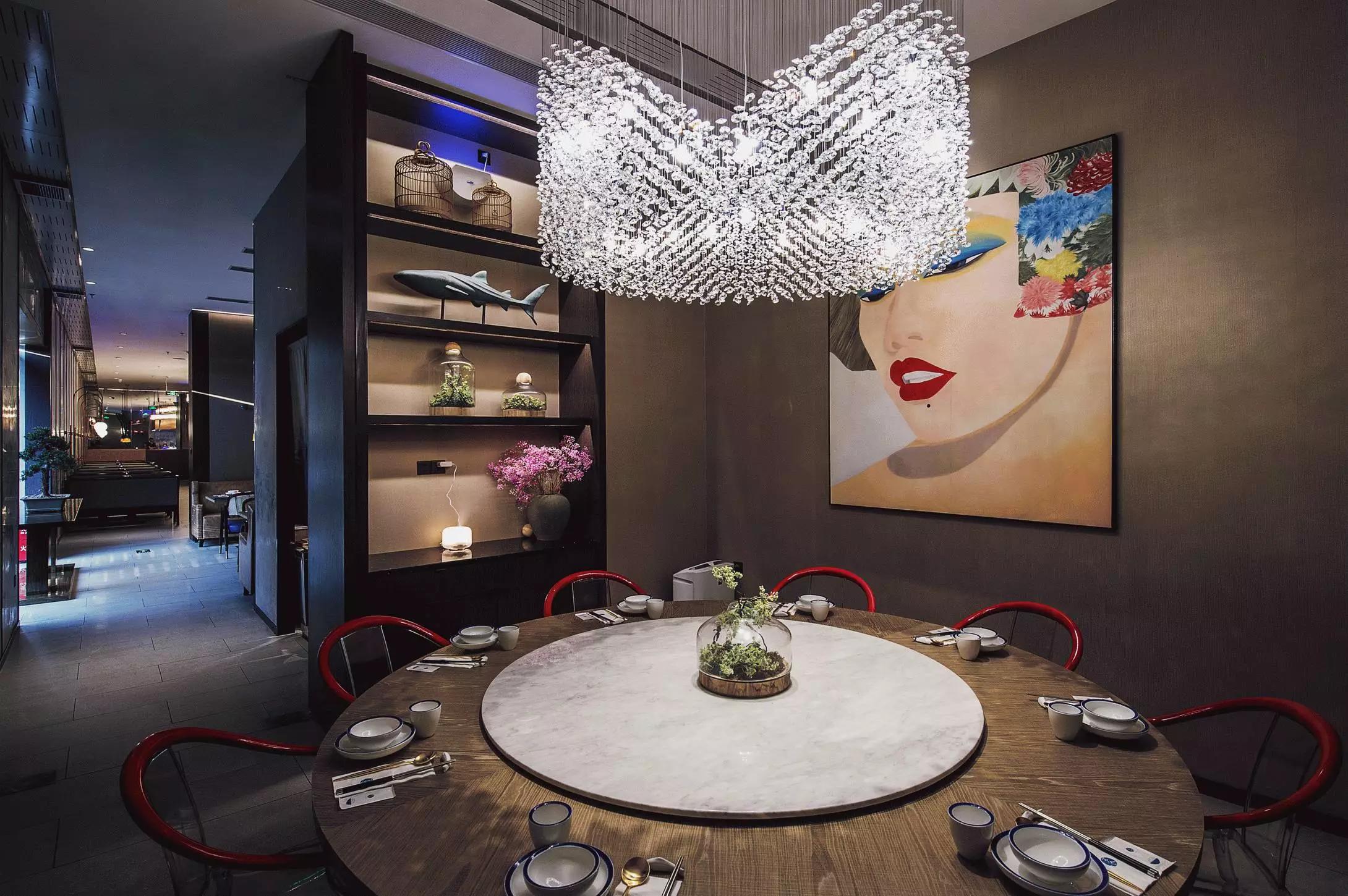 用餐區(qū)完全是一個(gè)開放的空間,沒有很多的隔斷,圓桌和方桌有序排布,既充分利用了空間又避免了單調(diào),結(jié)合燈具的設(shè)計(jì),就像在老家庭院里的大家庭聚餐——夜晚,歸來(lái)的親人們,在清涼的月色中,你來(lái)我往,和和樂(lè)樂(lè),傳遞此間。