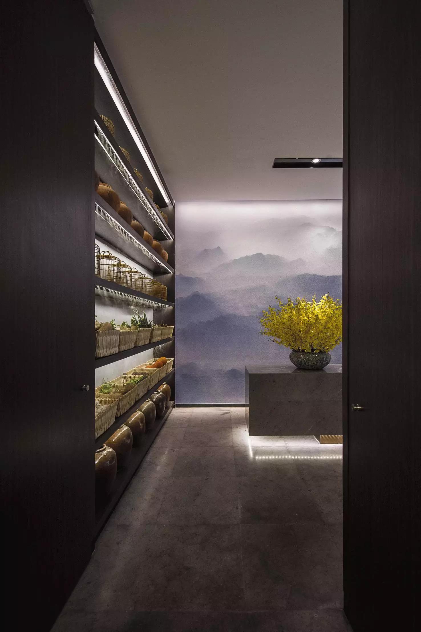玻璃隔斷上的貼膜,在燈光的作用下恰似雕花窗欞,與另一邊的壁畫一虛一實(shí)相映成趣。氤氳的群山壁畫,勾起對(duì)山海那邊,永遠(yuǎn)的家的思念。