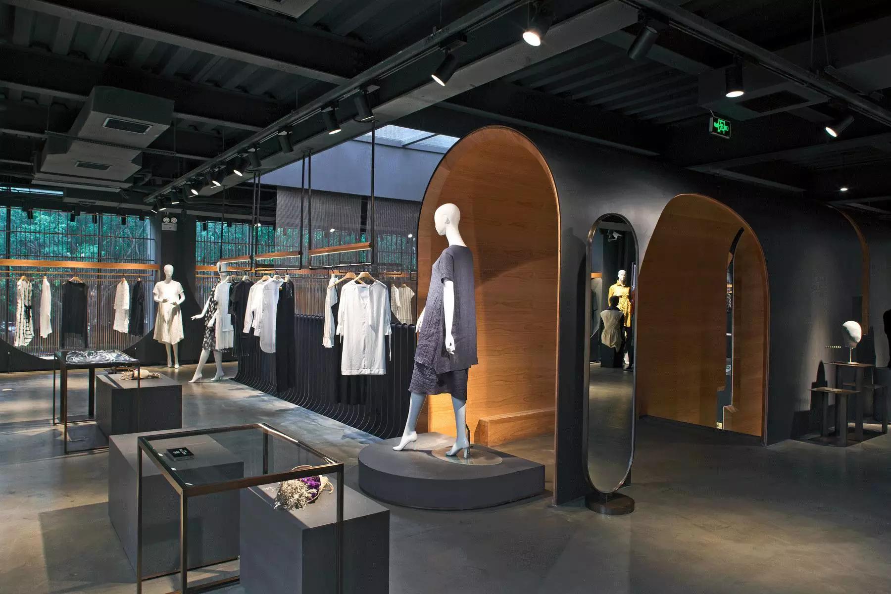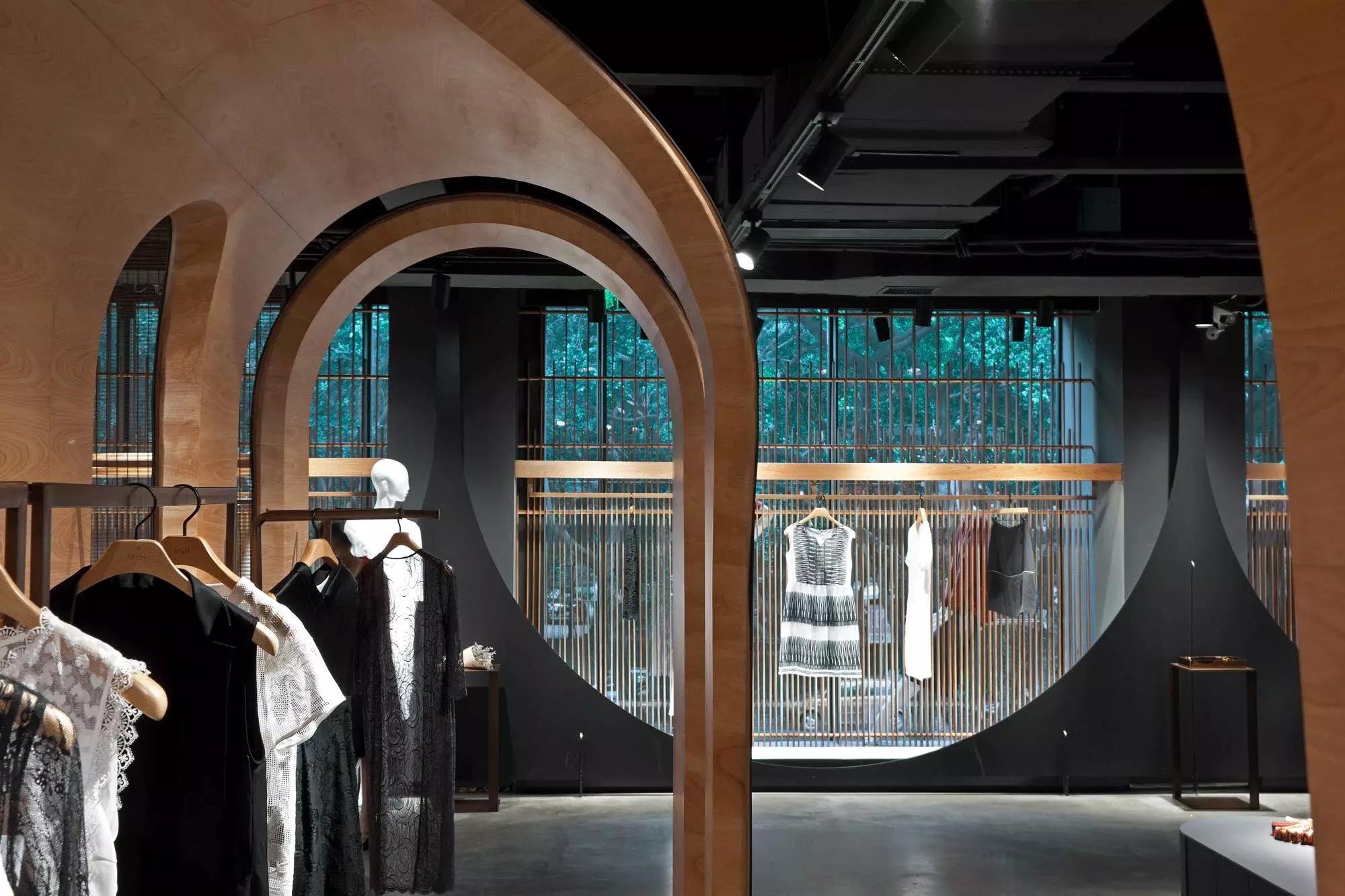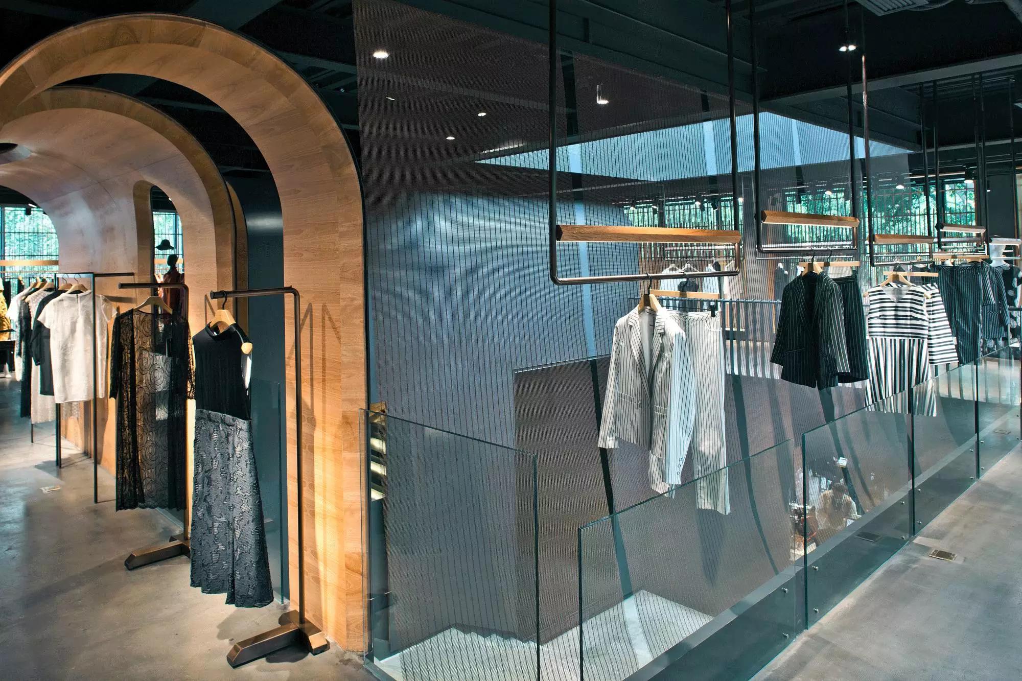 和一般常規(guī)服裝店陳列的概念不同,新的店鋪概念強(qiáng)調(diào)建筑化的零售模式。纖細(xì)的木屏風(fēng)結(jié)合貨架矗立在邊界處,渲染了空間和室內(nèi)飾面的豐富多樣性,建筑元素顯露材質(zhì)原始的質(zhì)感,烘托服裝的品質(zhì),這種手法為整個店鋪灌注純粹的氣氛,隱喻品牌的精神。天井樓梯釋放出不同光影效果,使整個空間與建筑取得一種時間與空間的對話。設(shè)計(jì)中,我們直白的將不同的“拱”垂直交疊,希望在垂直空間上制造不同的空間與體驗(yàn)。這個特殊的表現(xiàn)方式給人們提供強(qiáng)烈的視覺效果。依據(jù)商業(yè)需求,采用模塊式設(shè)計(jì),這樣可以使品牌不同功能具有最大的靈活性。