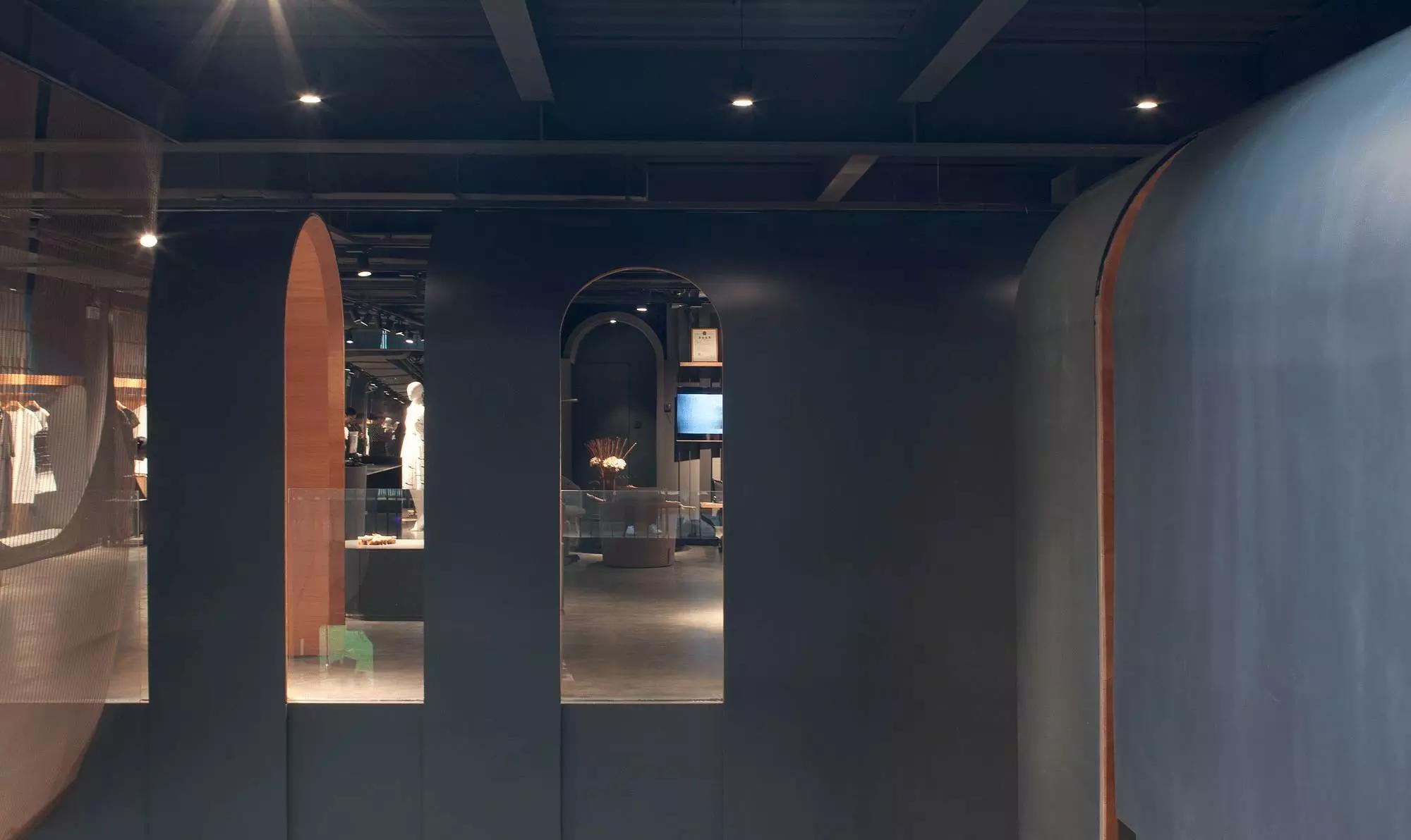 內(nèi)部空間希望呈現(xiàn)一種原始野性的魅力,采用鋼制的表皮帶來一種現(xiàn)實(shí)感。這種“直白”式的架構(gòu)材料,空間所形成的直接性與樸素性,加上大尺度的鋼板落地產(chǎn)生的力量感或輕盈感,使整個空間與原有場地建筑取得一種時間與空間的接續(xù)關(guān)系。利用“拱”多變的空間特性,產(chǎn)生不同的空間,打破了均質(zhì)的體驗(yàn)。這是一個回憶的過程,再一次將建筑的體量與空間對話,越是簡單的形體邏輯,越能給人帶來深刻的印象,弧拱曲線柔和,呈現(xiàn)不同角度的美感。弧拱的連續(xù)曲線把空間構(gòu)造成圍合區(qū)域,在這樣的方式下,內(nèi)部和外部保持著空間的連續(xù)性,這個理念使空間不拘泥于常規(guī),探索傳統(tǒng)類型空間的新秩序,"拱"在傳統(tǒng)建筑中扮演重要角色,并且在漫長的歷史中不斷豐富。我們試圖轉(zhuǎn)化傳統(tǒng)"拱",讓"拱"在均質(zhì)呆板的現(xiàn)代空間上制造新的突破,獲得自然能量并把它轉(zhuǎn)化為空間秩序。濃烈的空間美感,顯示該品牌的重要意義?;」巴臻g一、二層相連,創(chuàng)建出有趣的空間狀態(tài),吸引顧客的好奇心。