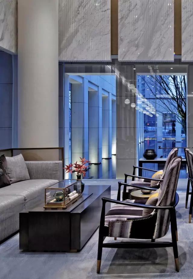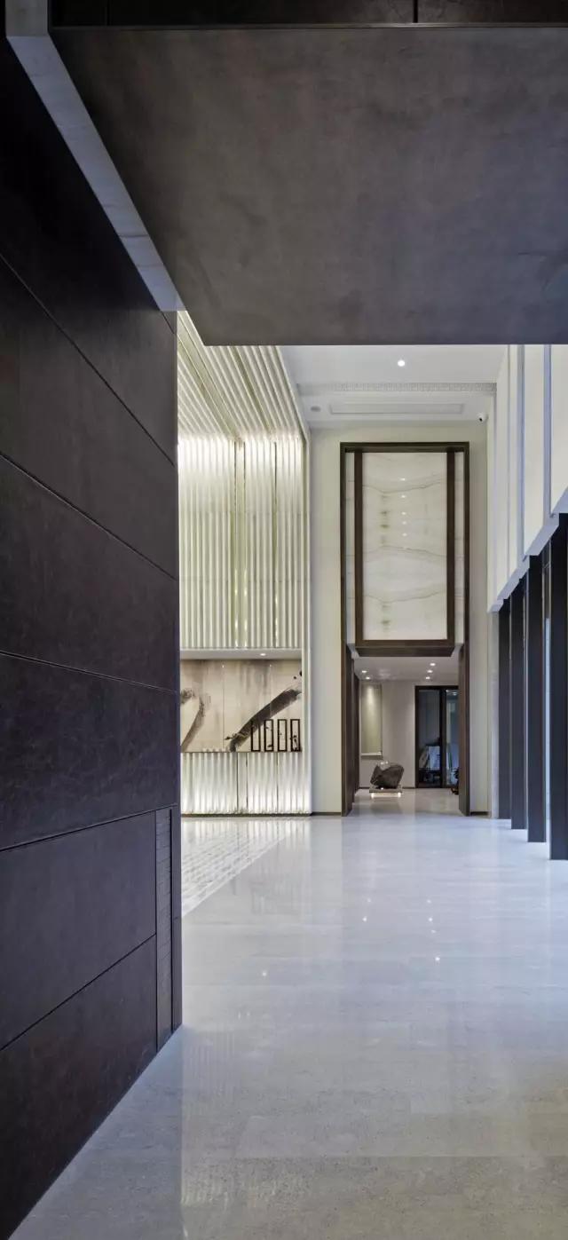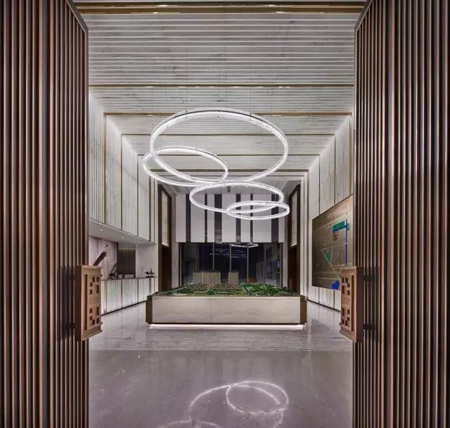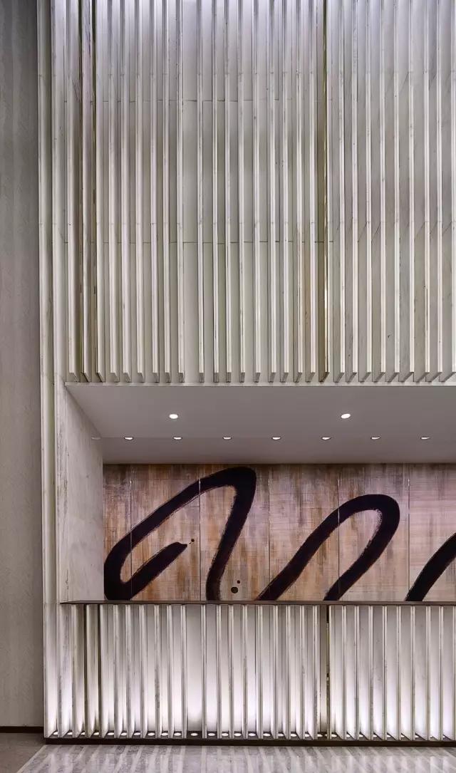 穿過(guò)充滿東方韻味的水中步道,在移步易景的氛圍里,不自覺(jué)地調(diào)慢身心節(jié)奏,悠然步入接待中心。設(shè)計(jì)師不拘泥于傳統(tǒng)石材的形體結(jié)構(gòu)和飾面方式,大膽創(chuàng)新地更改重構(gòu)。